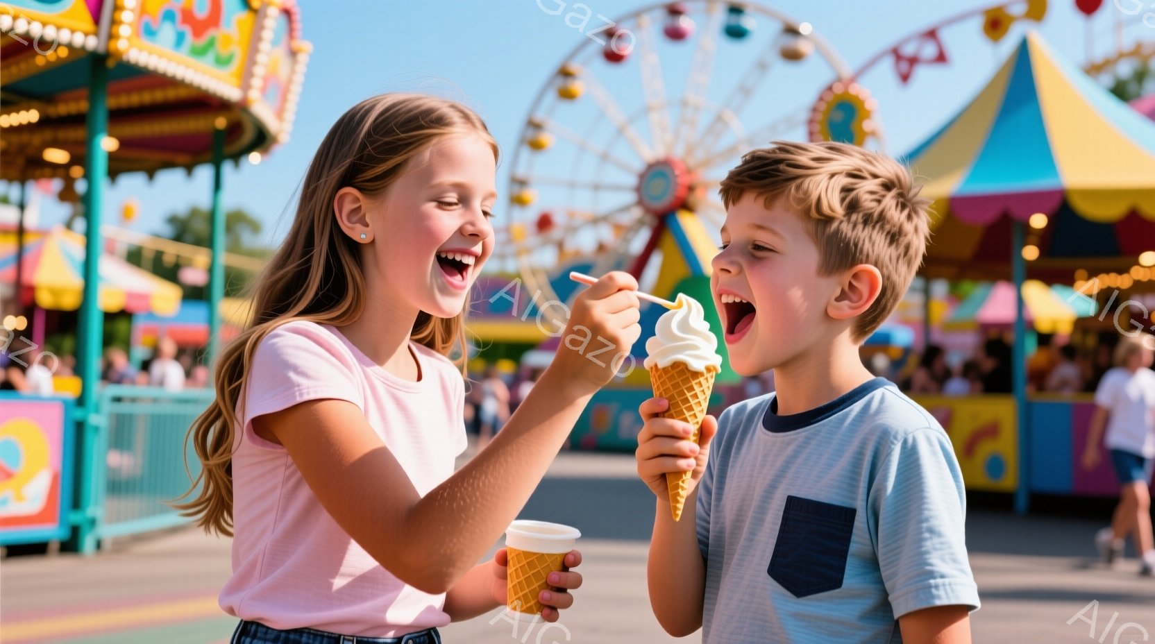 茶髪の少女が、クリーム色のソフトクリームをコーンから掬って、笑顔の少年に食べさせている様子が写っている。少年は口を開けてソフトクリームを受け取ろうとしており、二人は楽しそうで、幸せな雰囲気が漂っている。背景には遊園地の乗り物や人々が見え、晴れた空の下、賑やかな夏の日の光景であることがわかる。