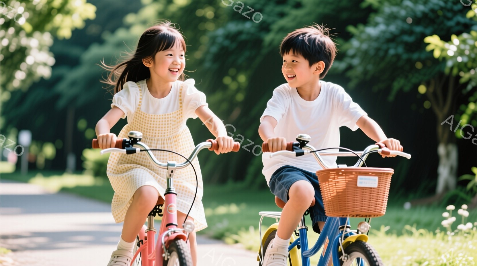 二人の子供が赤い自転車に乗って笑顔で走っています。女の子は黄色いワンピースを着て、髪を後ろでリボンで結んでいます。背景には緑豊かな木々があり、晴れた日の穏やかな雰囲気が漂っています。