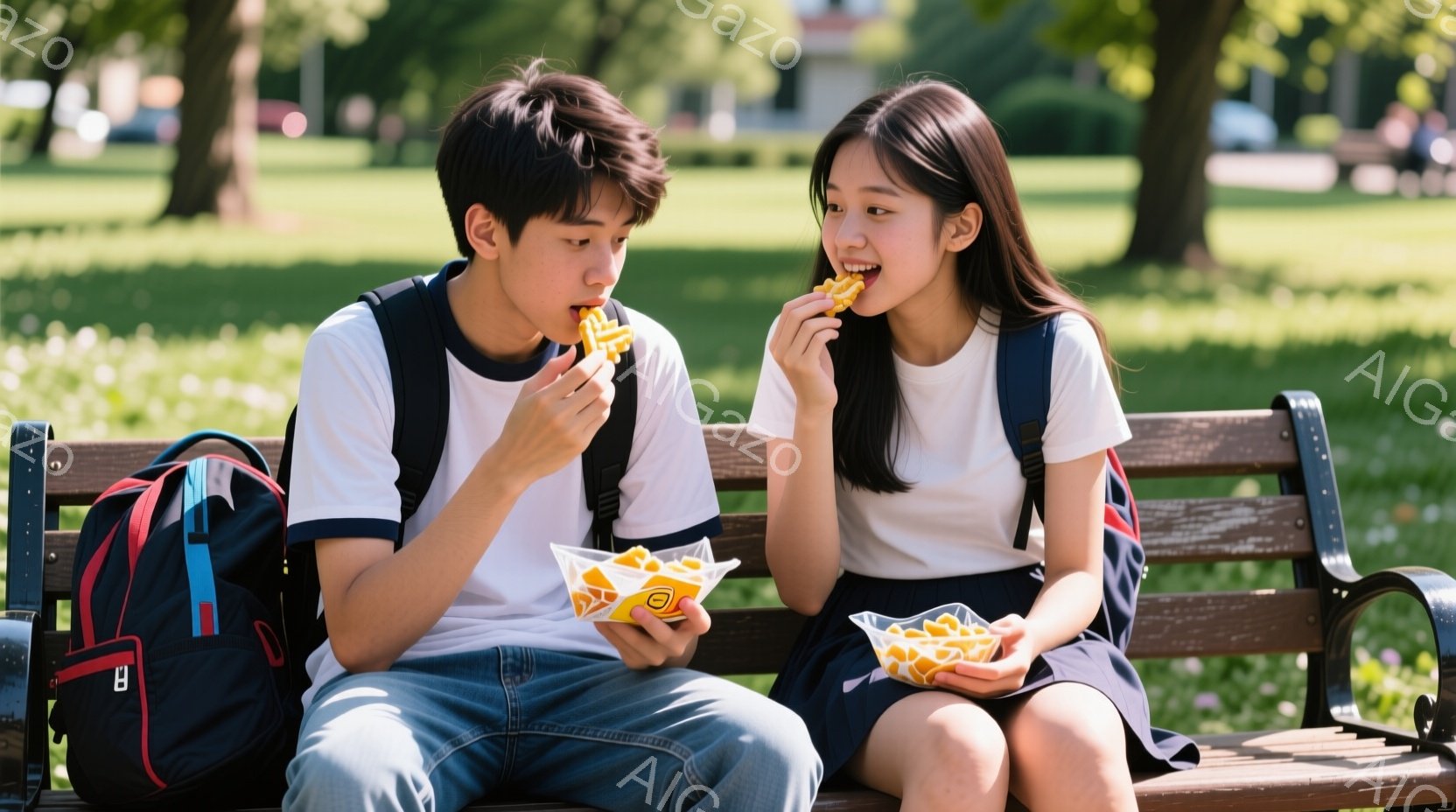 公園のベンチに座る少年と少女が、オレンジ色のスナック菓子を食べている。少年は濃い茶色の巻き毛で、濃い青色のTシャツとジーンズを着用しており、明るい笑顔を見せている。少女は長く茶色の髪を肩まで垂らし、白いTシャツに水色のスカートを着用、同じく笑顔でスナック菓子を楽しんでいる。