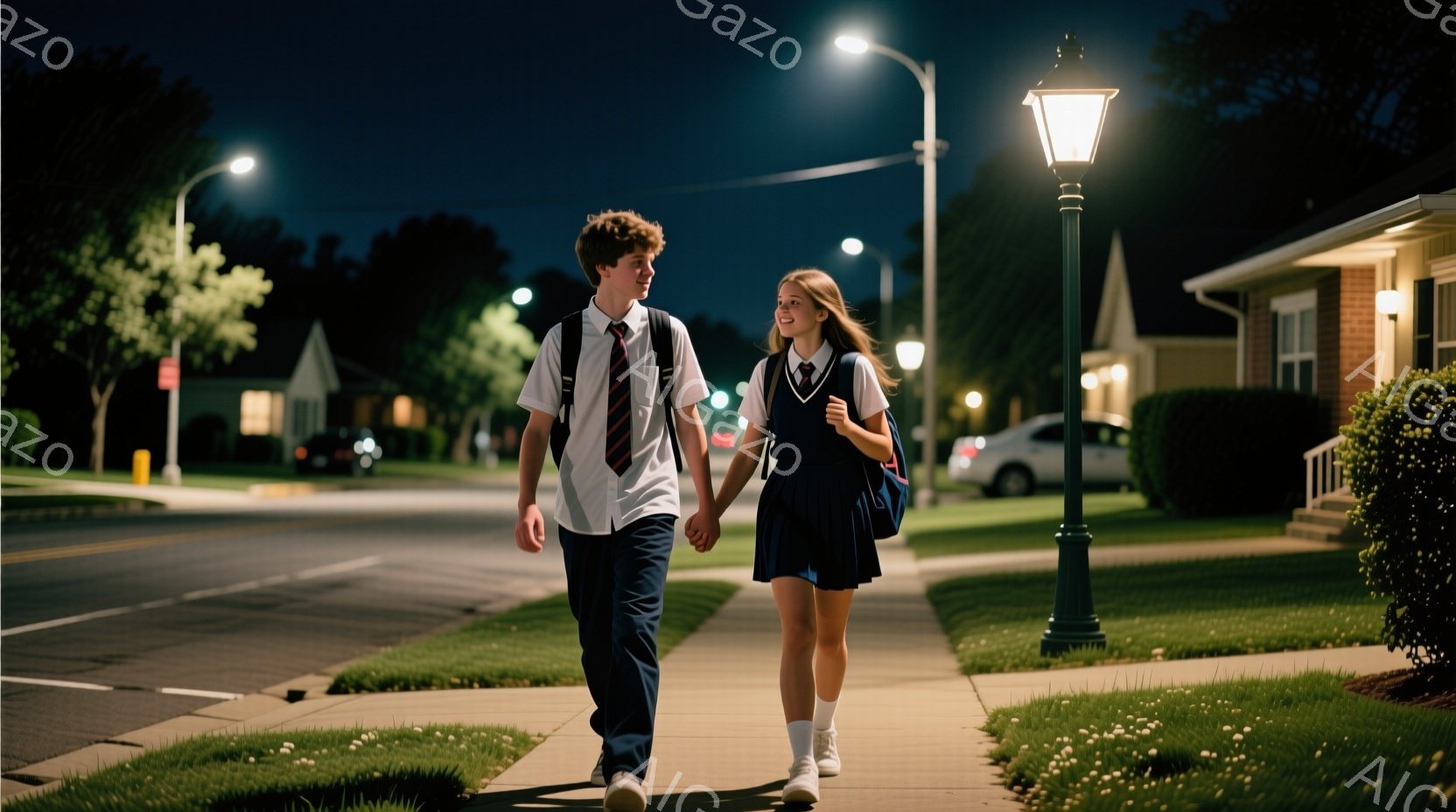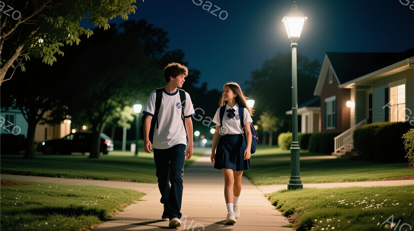若い男女が歩道を歩いている。少年は、茶髪で、白いTシャツ、ジーンズ、スニーカーを履いており、笑顔で少女を見つめている。少女は、ロングヘアで、白いブラウスと紺色のスカート、スニーカーを履いており、少年に微笑みながら歩いている。背景には、整然と並んだ住宅、緑の芝生、街灯があり、夜の穏やかな雰囲気を醸し出している。
