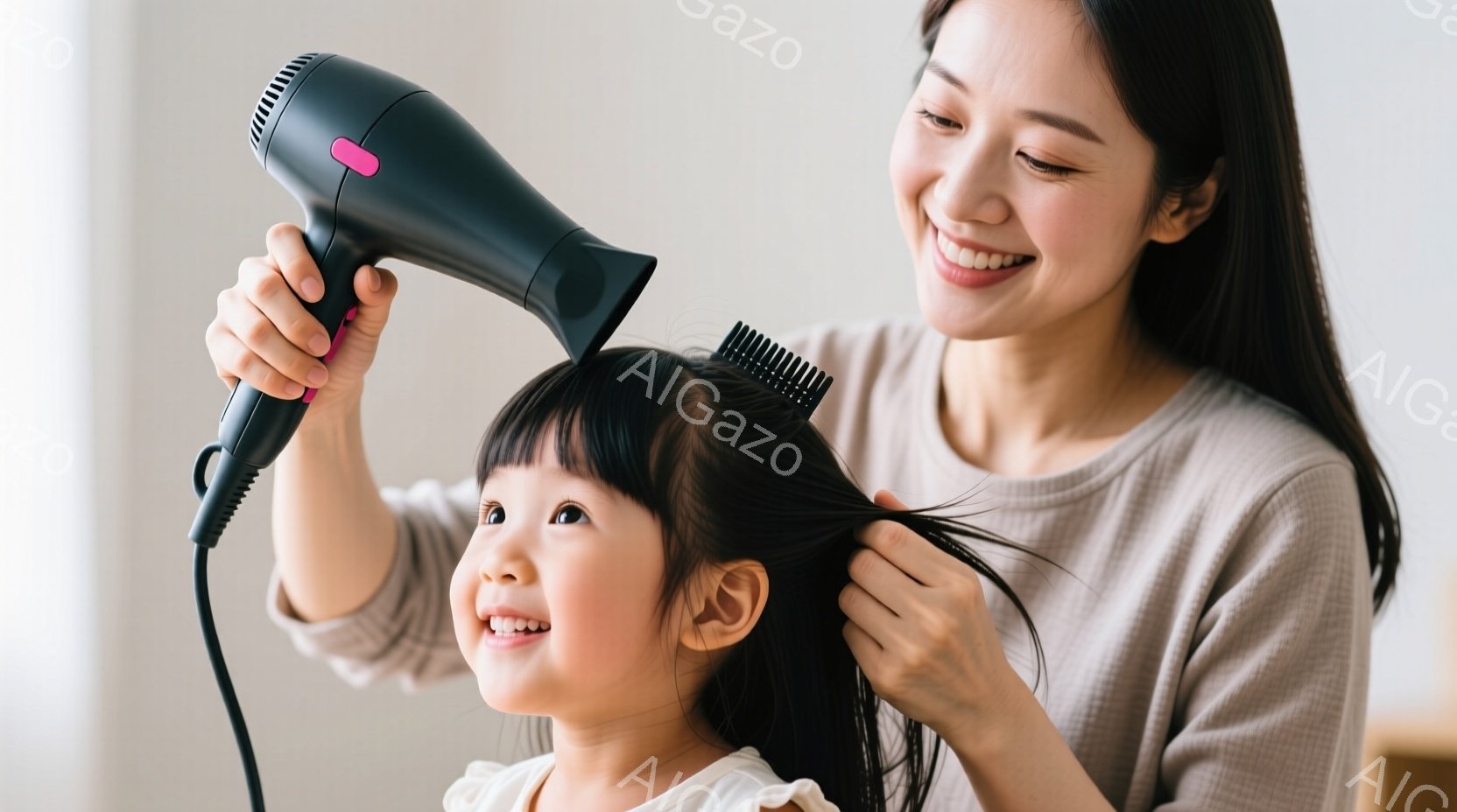 長い髪の女の子に母親がドライヤーで乾かしている様子が写っています。母親はベージュのセーターを着て微笑んでおり、女の子は白いTシャツを着て、少し上目遣いで嬉しそうにしています。背景にはベッドと間接照明が見え、温かくて穏やかな家庭の雰囲気が漂っています。