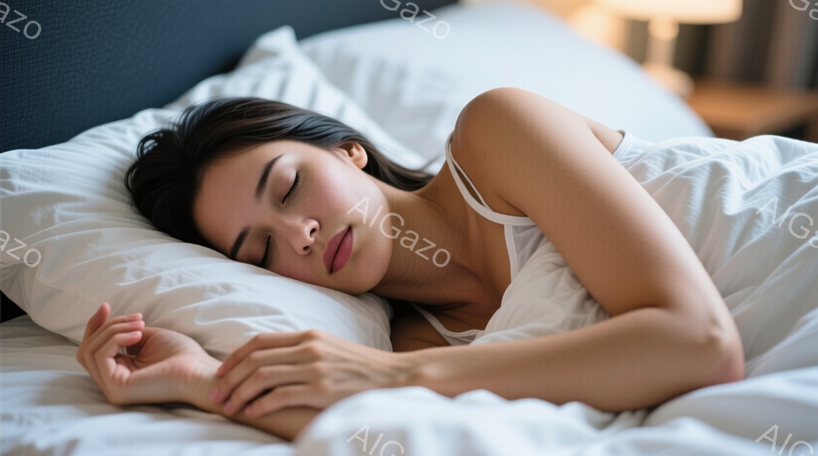白い枕に頭を預け、リラックスした表情で眠っている女性が写っています。彼女は白いキャミソールを着ており、長い黒髪が枕に広がっています。背景はぼやけていますが、明るい部屋の一部と観葉植物が見え、穏やかで平和な雰囲気が漂っています。
