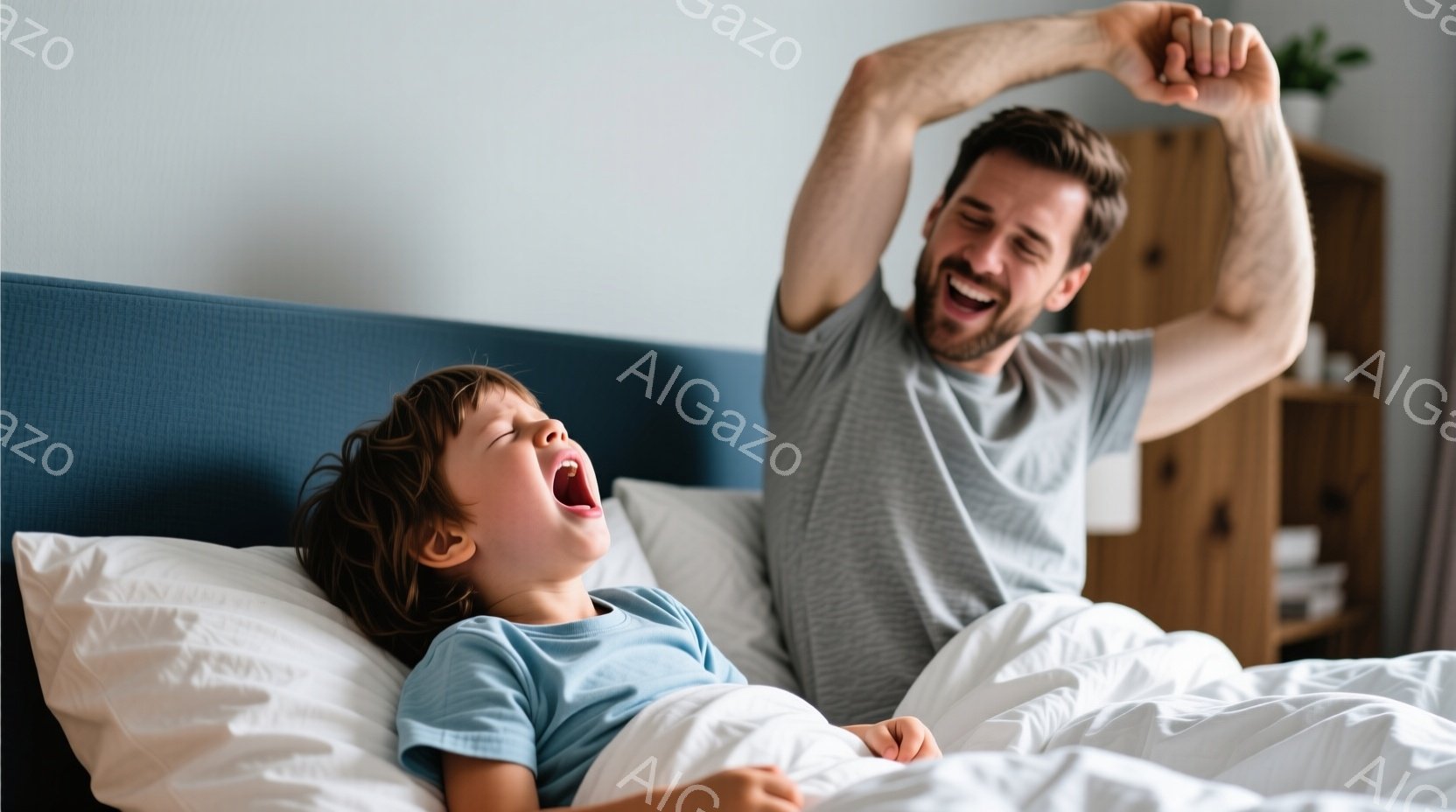 穏やかな光が差し込む寝室で、母親と父親、そして二人の幼い娘たちがベッドに座り、笑顔で互いを見つめ合っている。家族は皆パジャマ姿で、母親と娘たちはストレートヘア、父親は短髪である。背景には窓から差し込む光と薄いカーテンが見え、温かく幸せな家庭の雰囲気が漂っている。