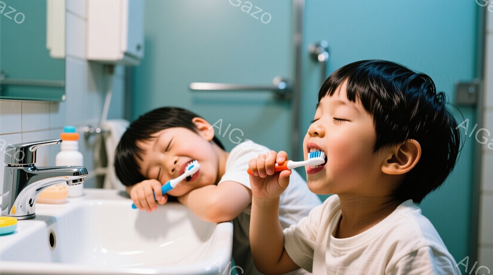 2人の子供がバスルームで歯を磨いています。彼らは白いTシャツを着ており、髪は短くカットされています。顔は集中して歯磨きをしており、背景には白い洗面台と蛇口、トイレ、壁に設置されたキャビネットが見えます。