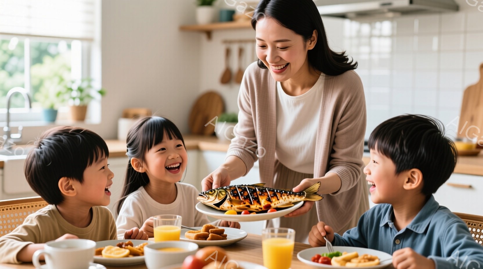 暖色系のキッチンで、母親が焼いた魚を二人の子供たちに差し出しています。子供たちは笑顔でそれを受け取ろうとしており、皆明るい表情をしています。テーブルには、果物、卵、野菜など、朝食と思われる料理が並べられています。