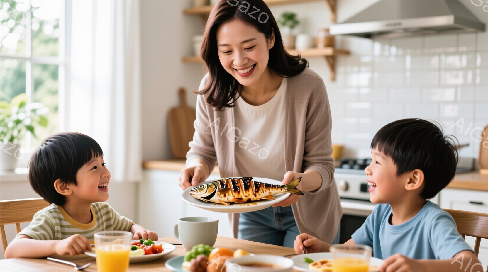 暖かい光が差し込むキッチンで、母親が焼いた魚の皿を3人の子供たちに見せながら微笑んでいます。子供たちは皆、明るい色の服を着て、口角を上げて楽しそうに笑っています。背景には木製のテーブル、オレンジジュース、そして控えめなキッチンの様子が見え、全体的に家族の温かい食事の雰囲気が漂っています。