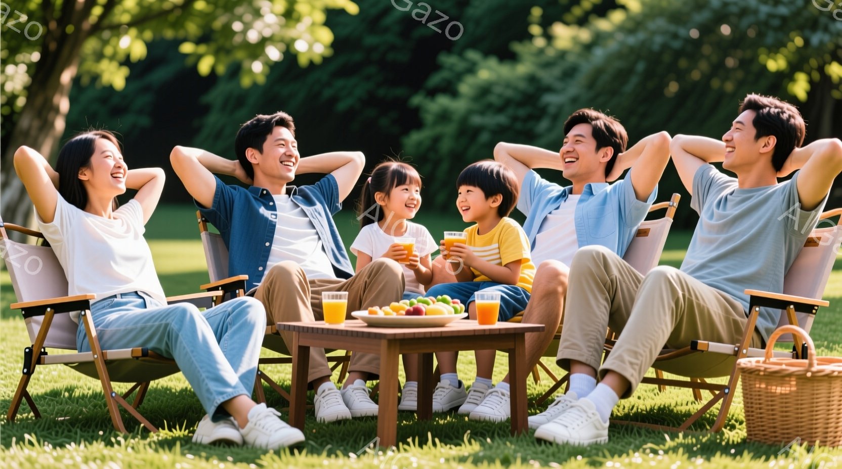 家族がリビングルームでリラックスした時間を過ごしている様子が描かれています。女性はオレンジ色のセーターを着て微笑み、男性は明るいブルーのシャツを着て両手を上げて喜んでいます。背景には観葉植物やシンプルな家具があり、明るい自然光が差し込み、温かく幸せな雰囲気が漂っています。