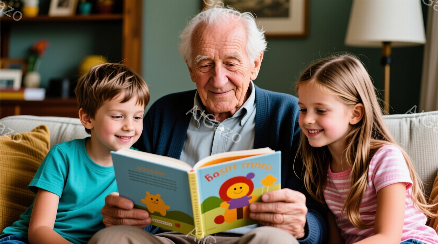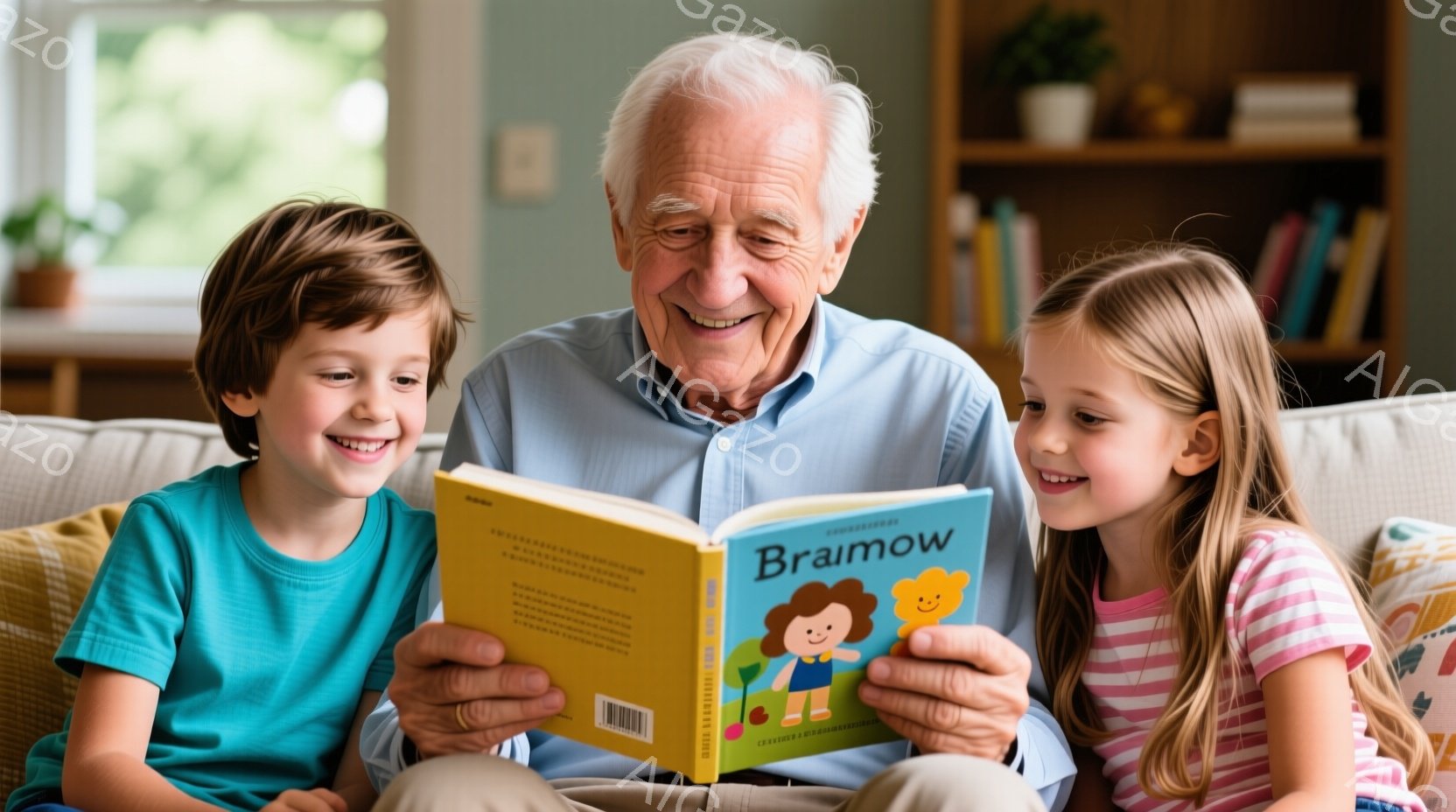 白髪の老人が、緑色のシャツを着た少年と、ピンク色のシャツを着た少女に絵本を読んでいます。3人はソファに座っており、老人の表情は穏やかで、子供たちは絵本に興味津々で笑顔を浮かべています。背景には、クリーム色の壁と緑の植物が見え、暖かい家庭的な雰囲気を感じさせます。