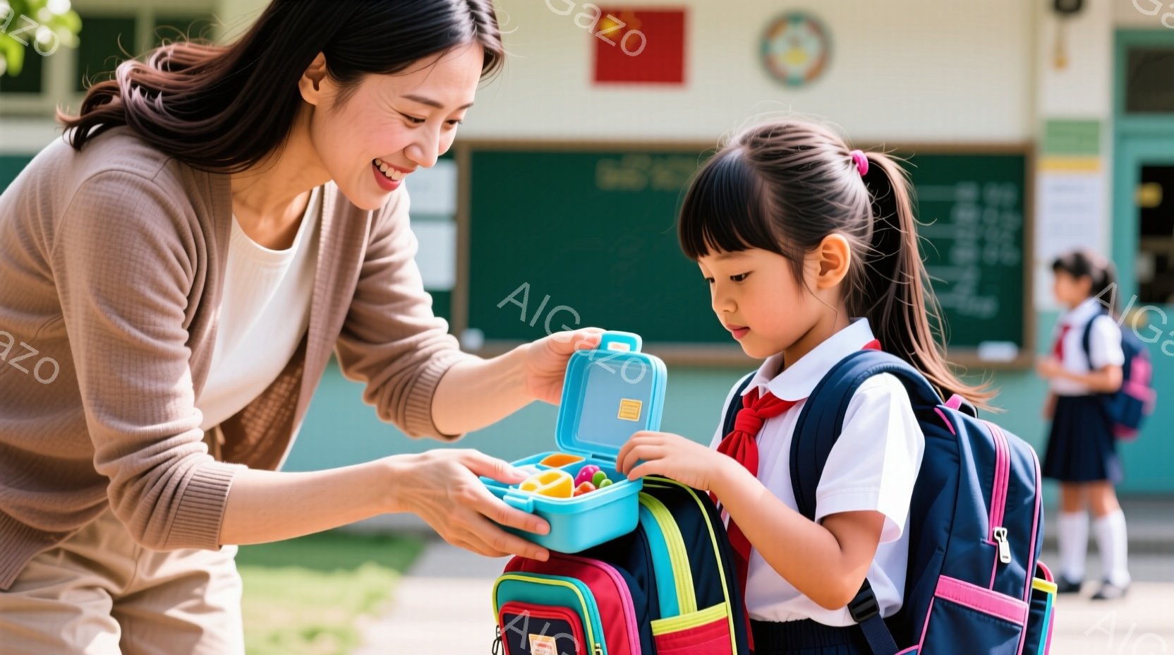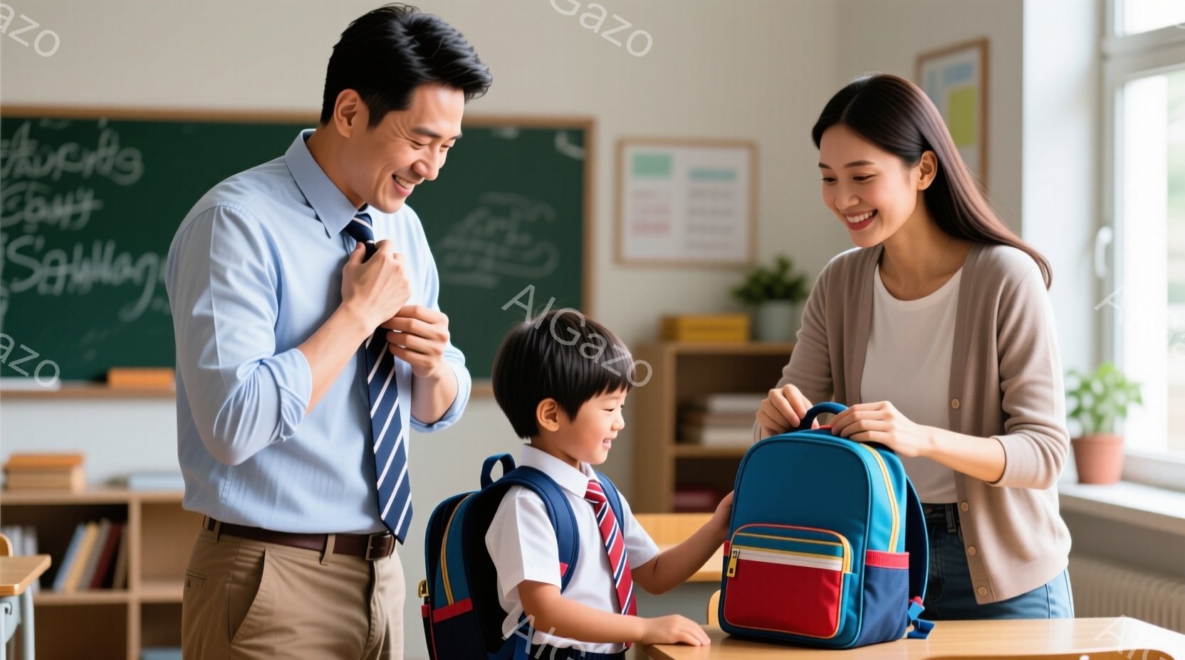 教室で、若い男性教師はネクタイを締め、笑顔を見せています。少年は青いリュックサックを背負い、母親らしき女性と話しながら何かを探しているようです。背景にはカラフルな掲示板や木製の机があり、明るく活気のある学習環境が感じられます。