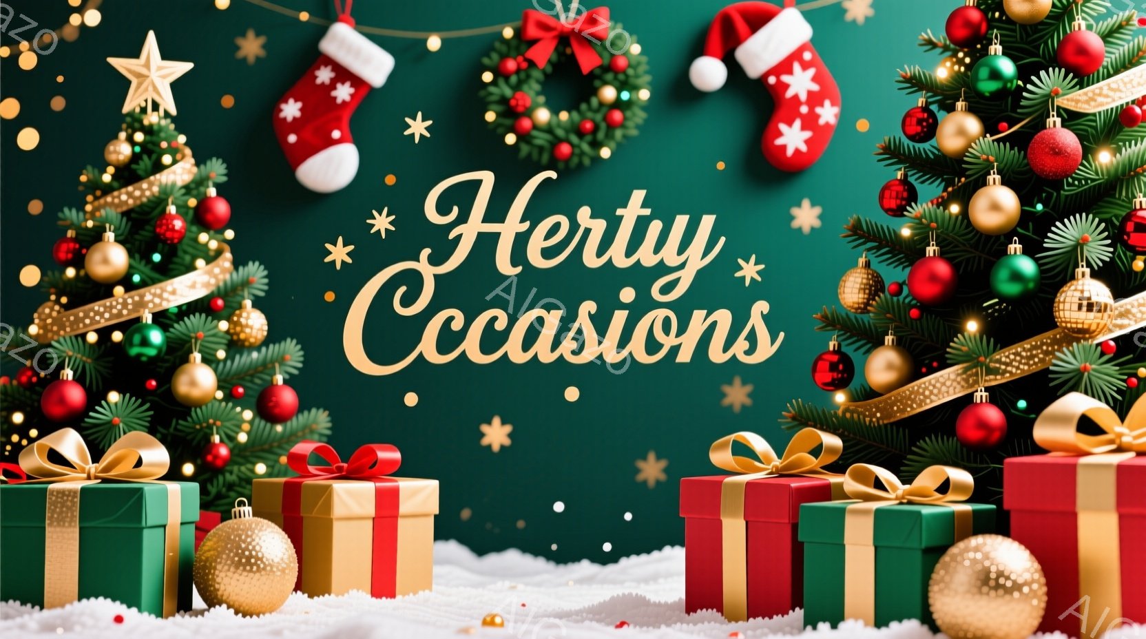 深緑色の背景に、クリスマスツリーの葉、赤いオーナメント、金色のオーナメント、雪の結晶が散りばめられています。下部には、緑と赤のリボンで飾られたプレゼントボックスが並べられています。全体的に、華やかで温かいクリスマスの雰囲気が漂っています。