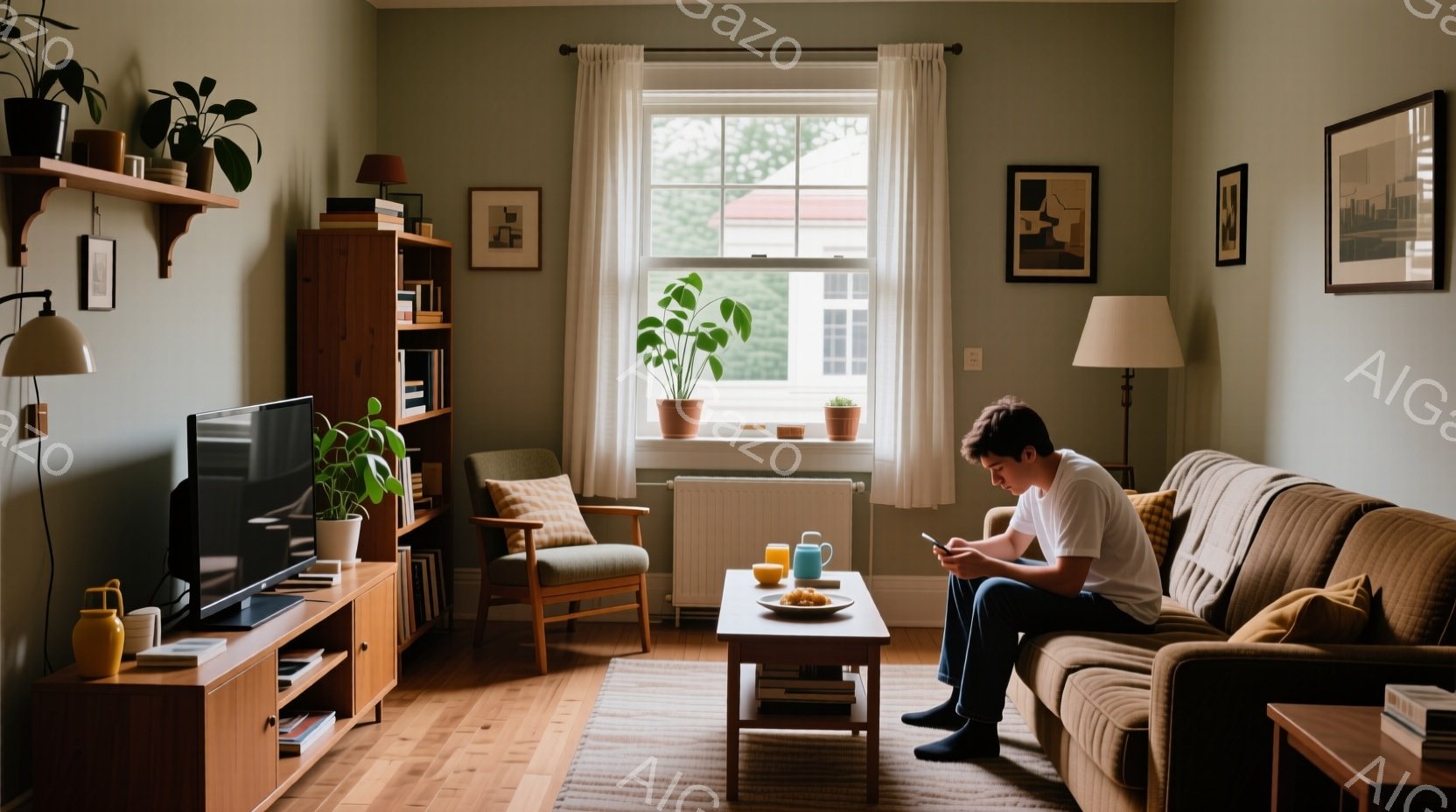 室内には、薄茶色のソファに座り、スマートフォンを見ている若い男性がいます。彼は白いTシャツを着ており、短く暗い髪をしています。窓からは自然光が差し込み、木製の家具や観葉植物が配置された、穏やかで落ち着いた雰囲気の居間です。