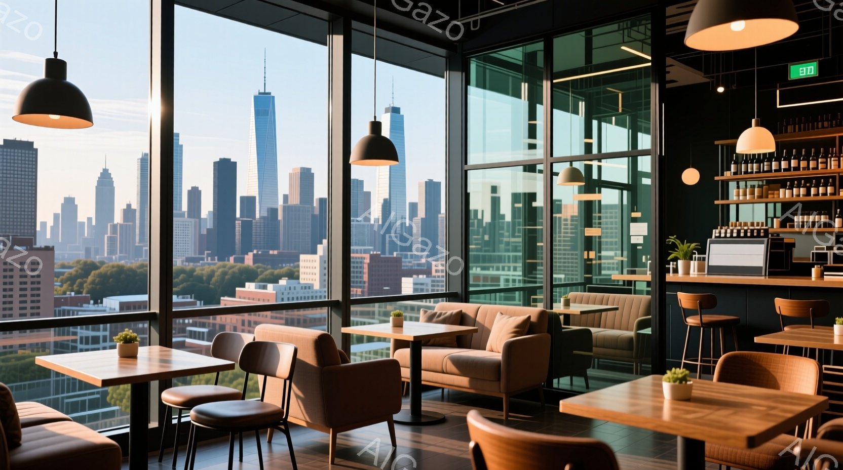 広々としたカフェの内部で、大きな窓から高層ビル群が望める景色が広がっています。明るい木製のテーブルとソファ席が配置され、モダンで落ち着いた雰囲気が漂います。カウンターにはバリスタがおり、準備をしている様子が見えます。