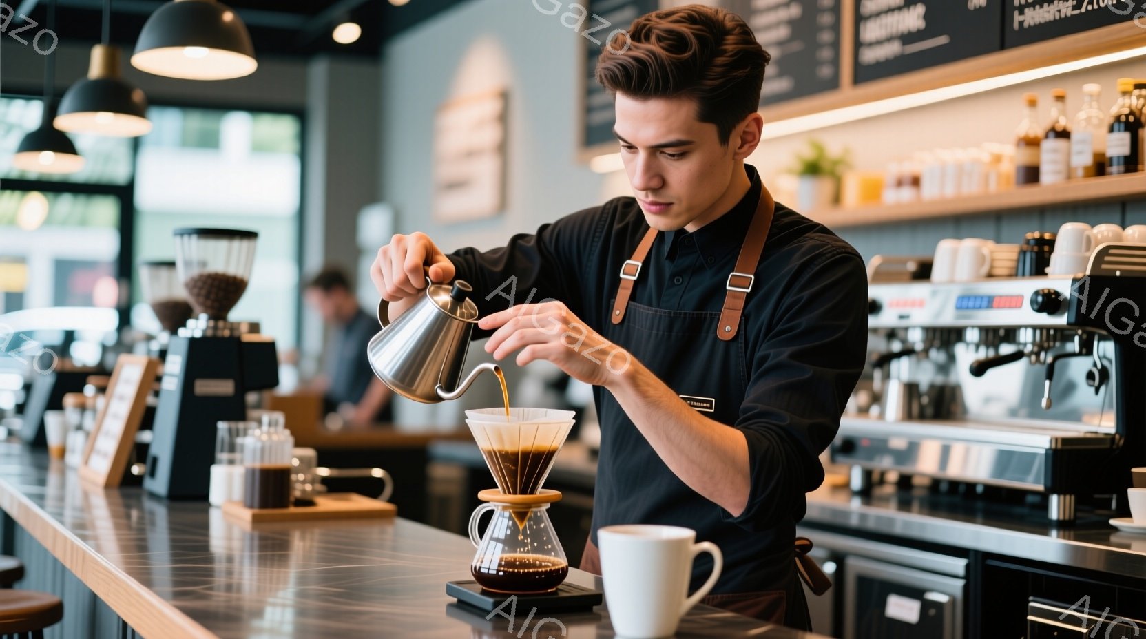 黒いエプロンを着た男性が、ドリップコーヒーを作っています。彼は真剣な表情で、丁寧にコーヒーポットからコーヒーを注いでおり、姿勢も優雅です。背景には、ステンレス製のコーヒー器具や棚が並び、明るく清潔なカフェの雰囲気を感じられます。