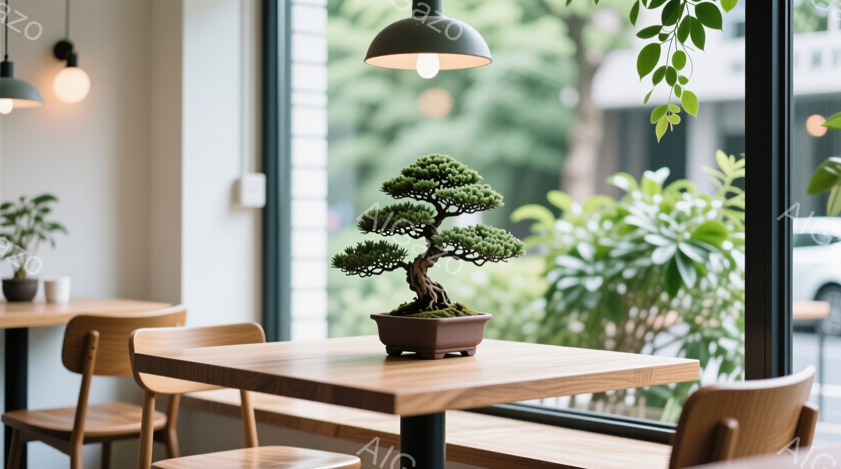 明るい室内には、木製のテーブルの上に盆栽が置かれています。大きな窓からは緑豊かな庭が見え、自然光が差し込んで穏やかな雰囲気を醸し出しています。シンプルなデザインの椅子とソファーが配置され、リラックスできる空間となっています。
