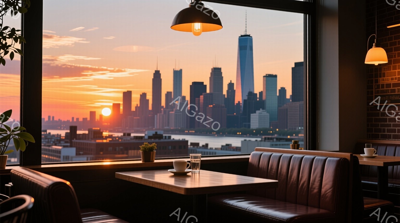革張りのソファが並ぶ室内、窓の外には夕焼けに染まる摩天楼が見える。テーブルの上には一杯のコーヒーが置かれ、静かで落ち着いた雰囲気が漂っている。夕焼けのオレンジ色が都市のシルエットを強調し、暖かく穏やかな印象を与える。