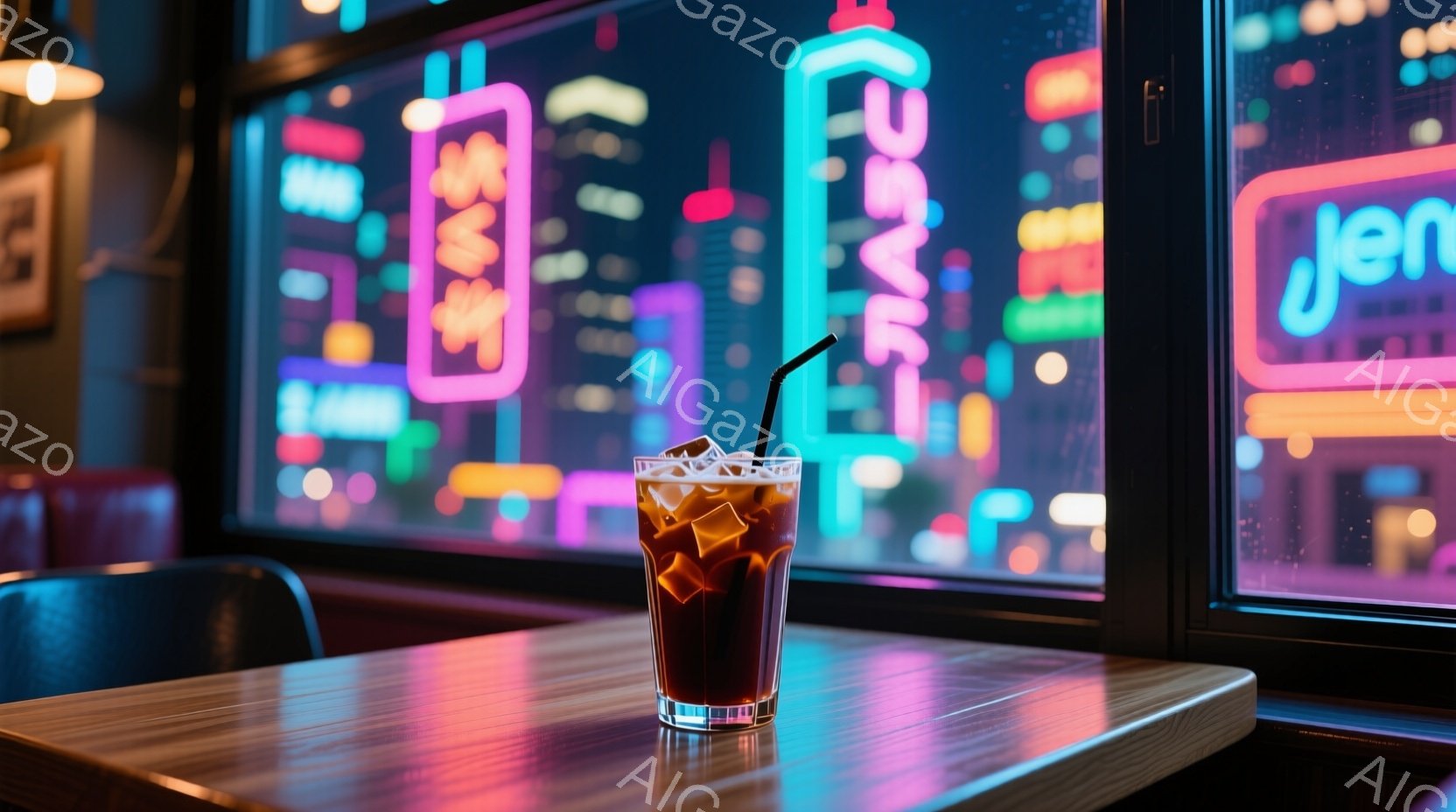 鮮やかなネオンライトに照らされた木製のテーブルの上に、ミルクティーが入ったグラスが置かれている。窓の外には高層ビル群が広がり、夜の都市の活気を感じさせる。全体的に、都会的で洗練された、少しノスタルジックな雰囲気である。