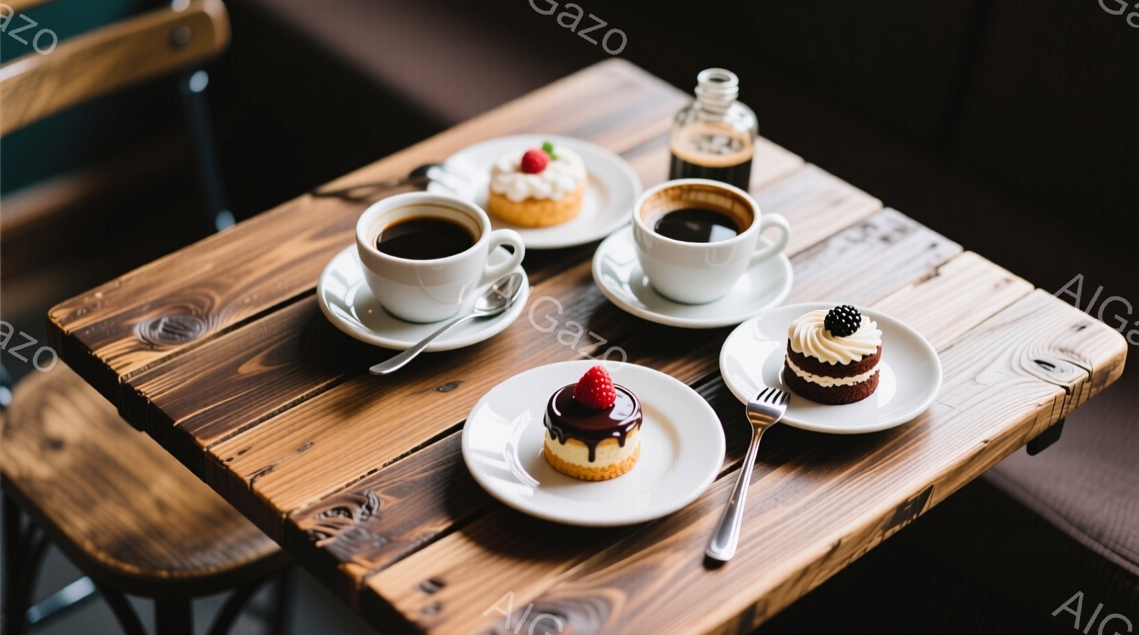 磨かれた木のテーブルの上に、コーヒーとケーキが置かれています。一つはブラックコーヒーで、もう一つはラテアートが施されたミルクコーヒーです。ケーキは、イチゴが飾られたショートケーキと、小さなチョコレートケーキの二種類で、落ち着いたカフェの雰囲気が漂っています。