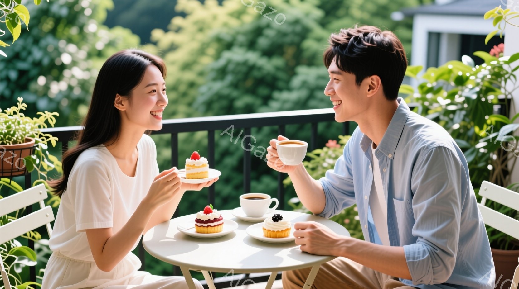 若い男女が、緑色の円卓を挟んで向かい合って座っています。女性は白いワンピースを着て髪を後ろでまとめ、ケーキをフォークでつつきながら微笑んでいます。男性は水色のシャツにベージュ色のズボンを履き、コーヒーカップを持ちながら女性を見て笑顔を浮かべており、背景には緑豊かな木々と建物が見え、晴れた日の穏やかな雰囲気が漂っています。