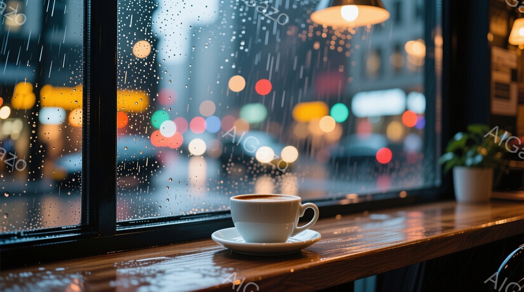 窓の外は激しい雨が降り、街の光がぼやけて見える。テーブルの上には白いカップに入ったコーヒーが置かれ、雨の日の静かな一息を誘う。木製のテーブルの温かさと、雨の冷たさのコントラストが印象的で、どこかノスタルジックな雰囲気が漂う。