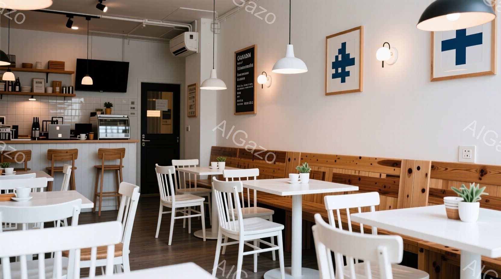 白を基調としたカフェの内部で、木目調の壁と白いテーブルと椅子が整然と並んでいます。テーブルの上には小さな花瓶が置かれ、壁にはシンプルな装飾が施されています。全体的に清潔感があり、落ち着いた雰囲気で、静かにコーヒーを楽しむのに適した空間です。