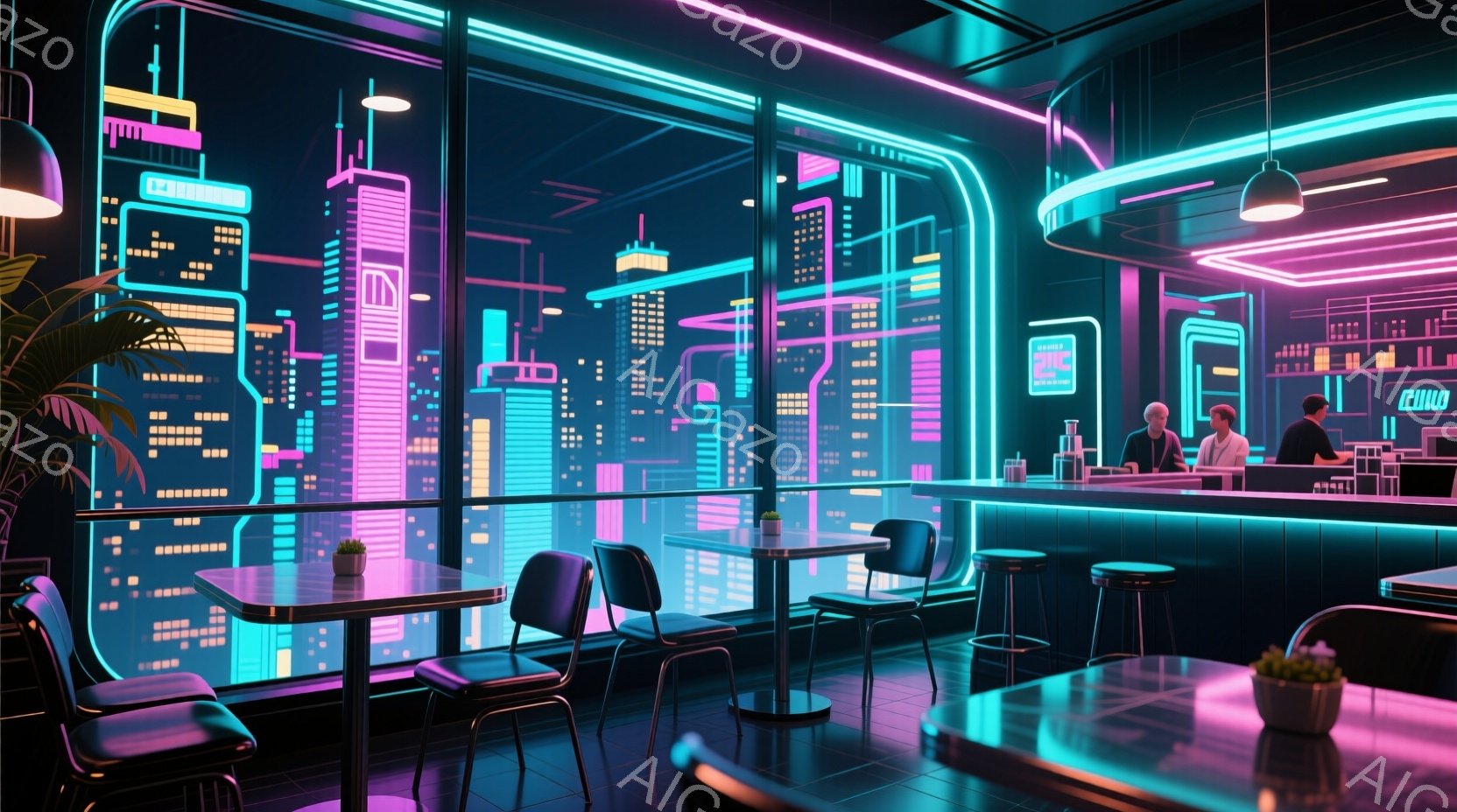 未来都市の夜景を望む、ネオンライトで彩られたモダンなカフェテリアです。紫と青の光が支配する空間には、円形のテーブルと赤い椅子が整然と並び、洗練されたバーカウンターが奥にあります。窓の外には高層ビル群が広がり、その光が室内を幻想的に照らしています。