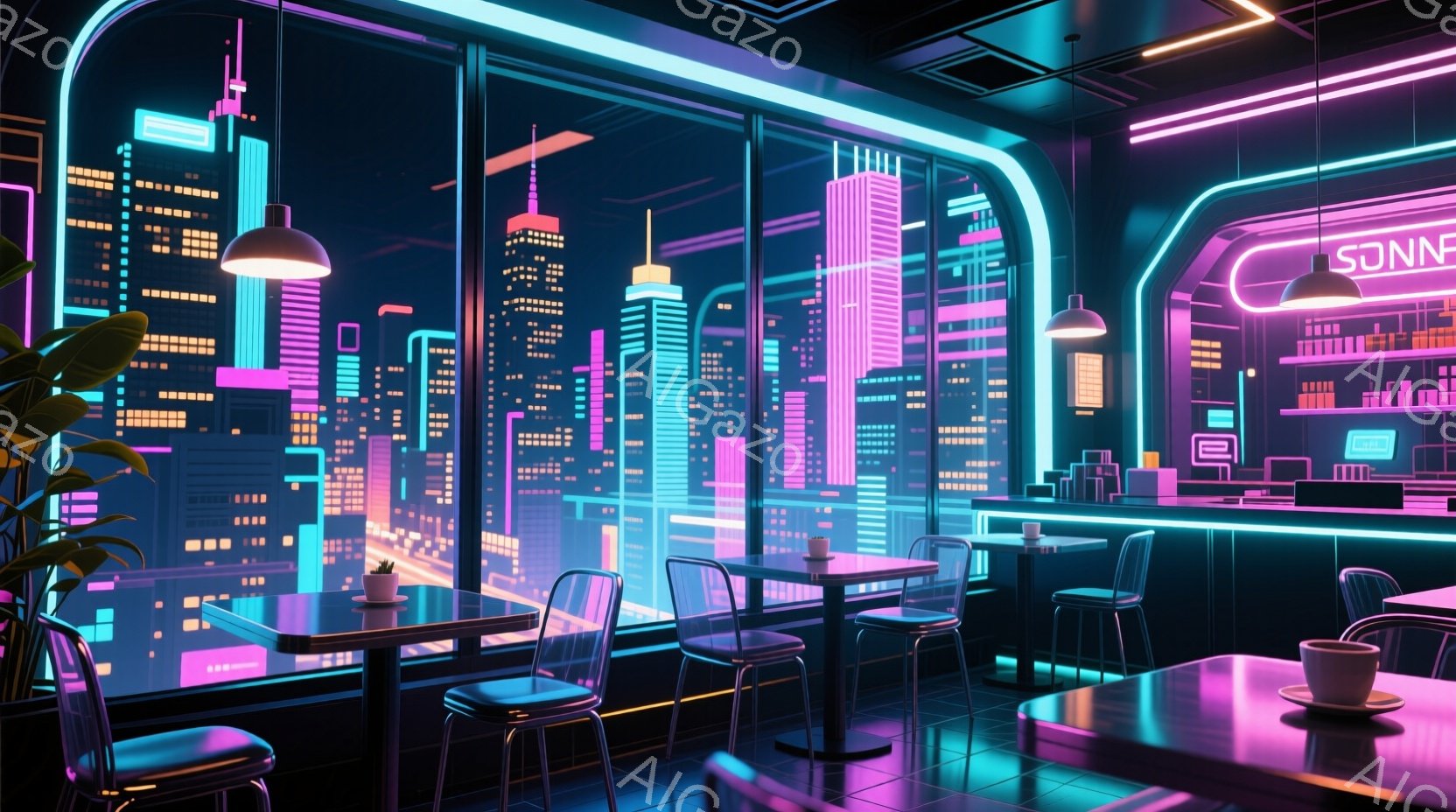 夜景のディスコバー、未来的なサインが見られる。シーリングの墨汁は異世界の風味を感じさせる。座席はダイニングテーブルに配置され、エレクトロポップスタイルの家具と明るい色がその美しさを出している。