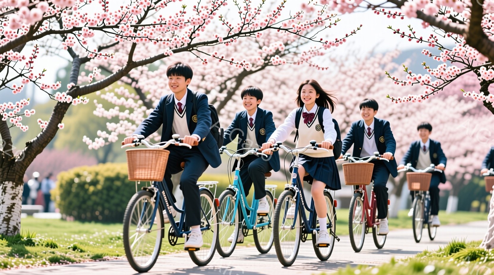 制服を着た中学生または高校生が、桜並木の中を自転車で走っている様子が写っている。彼らは皆笑顔で、明るく元気な表情をしている。背景には、満開の桜並木が広がり、春の暖かな日差しが降り注いでいる。