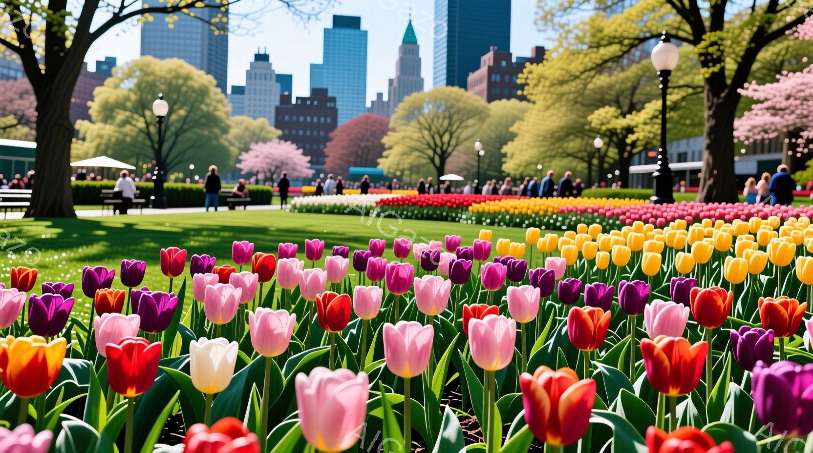 広大な緑の芝生の上に、色とりどりのチューリップの花が咲き乱れ、その奥には高層ビル群がそびえ立っています。人々はカジュアルな服装で散歩を楽しんだり、ベンチでくつろいだりしており、晴天の下、穏やかで平和な雰囲気が漂っています。背景には、緑豊かな木々が咲き誇り、春の暖かさを感じさせる鮮やかな色彩が広がっています。