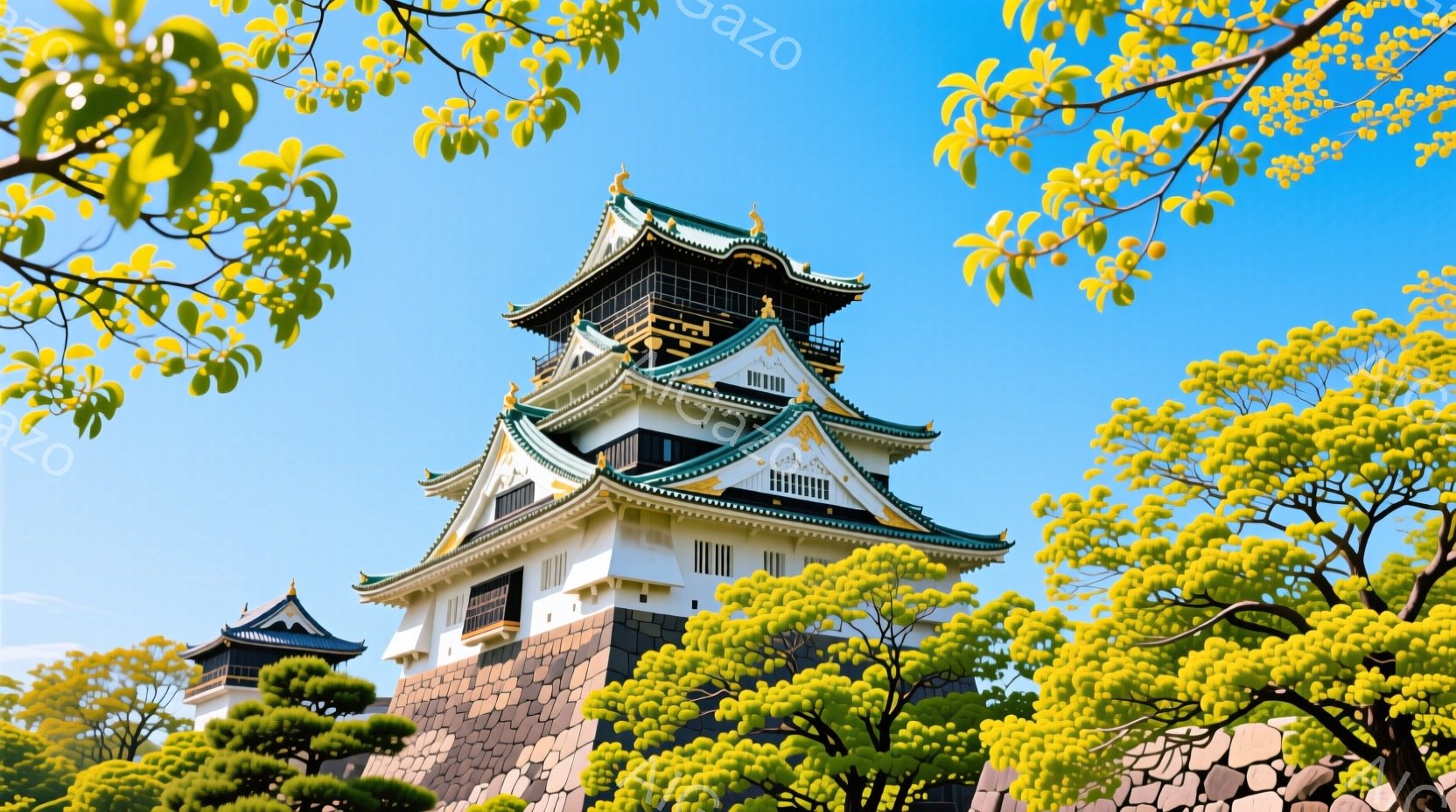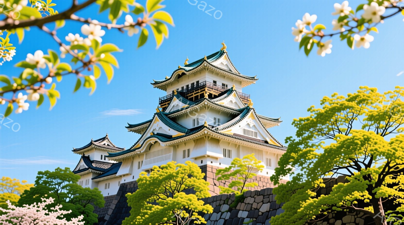 白い城が緑の木々の間にそびえ立っており、鮮やかな青空を背景に壮大な姿を見せています。城は複数の階層で構成され、それぞれの屋根には緑色の装飾が施されており、日本の伝統的な建築様式が際立っています。城の周囲には石垣が築かれており、自然と調和した美しい景観を作り出しています。