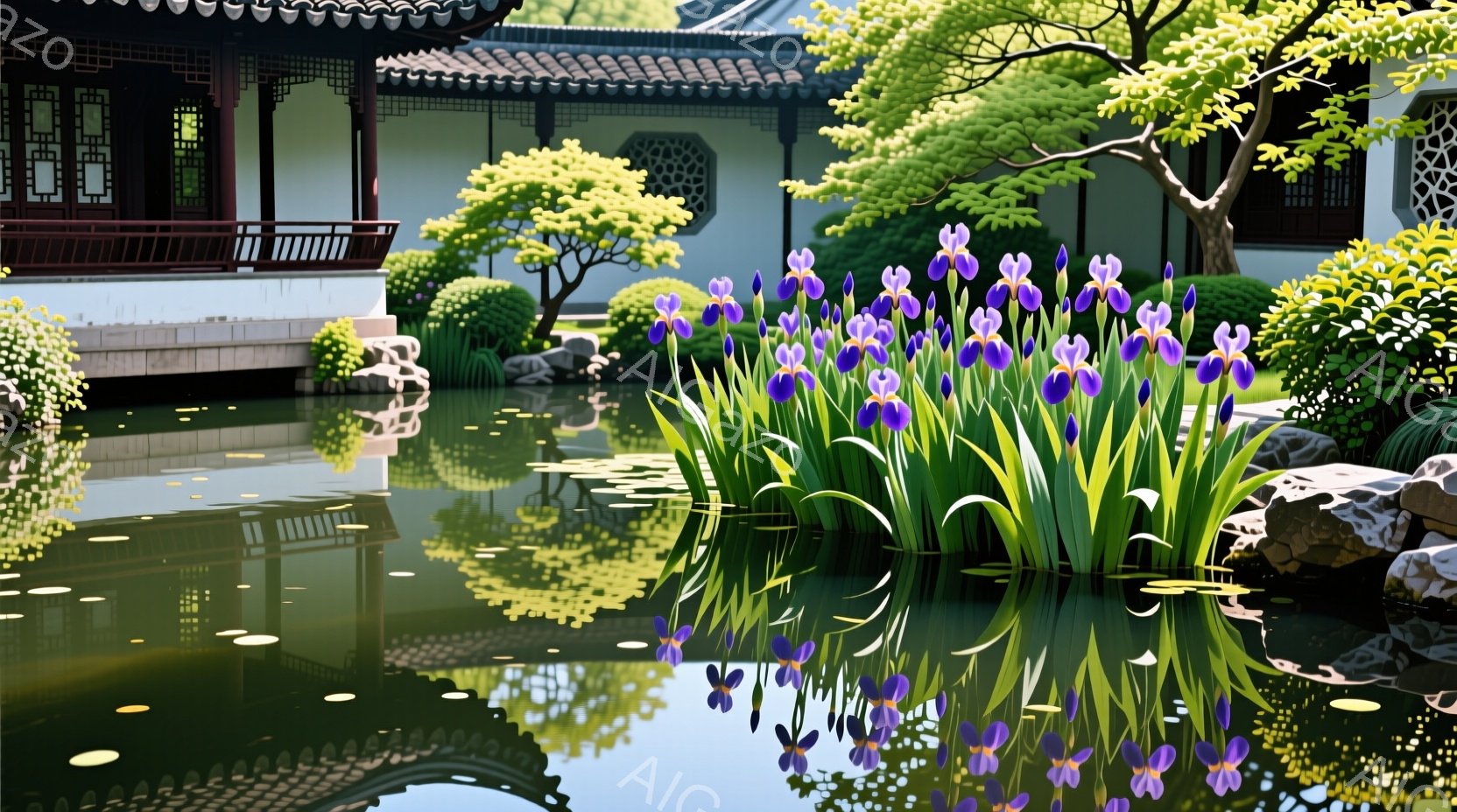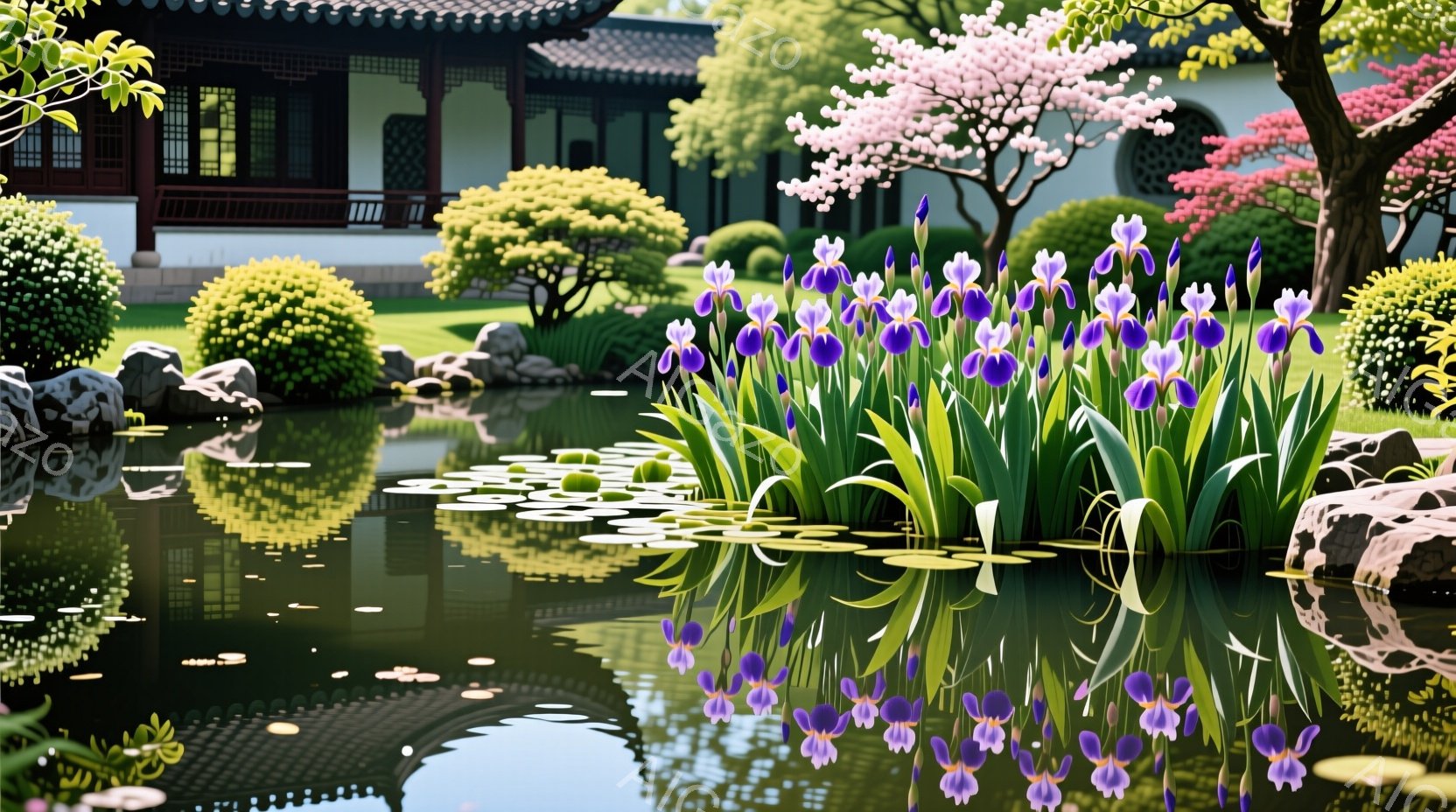 広大な池には、紫色の菖蒲の花が咲き誇り、水面にはその美しい姿が映り込んでいます。池の畔にはピンク色の花が咲く木々があり、背景には伝統的な様式の建物が見え、穏やかで平和な雰囲気を醸し出しています。水面には睡蓮の葉が点在し、自然の静けさと美しさを感じさせる光景です。