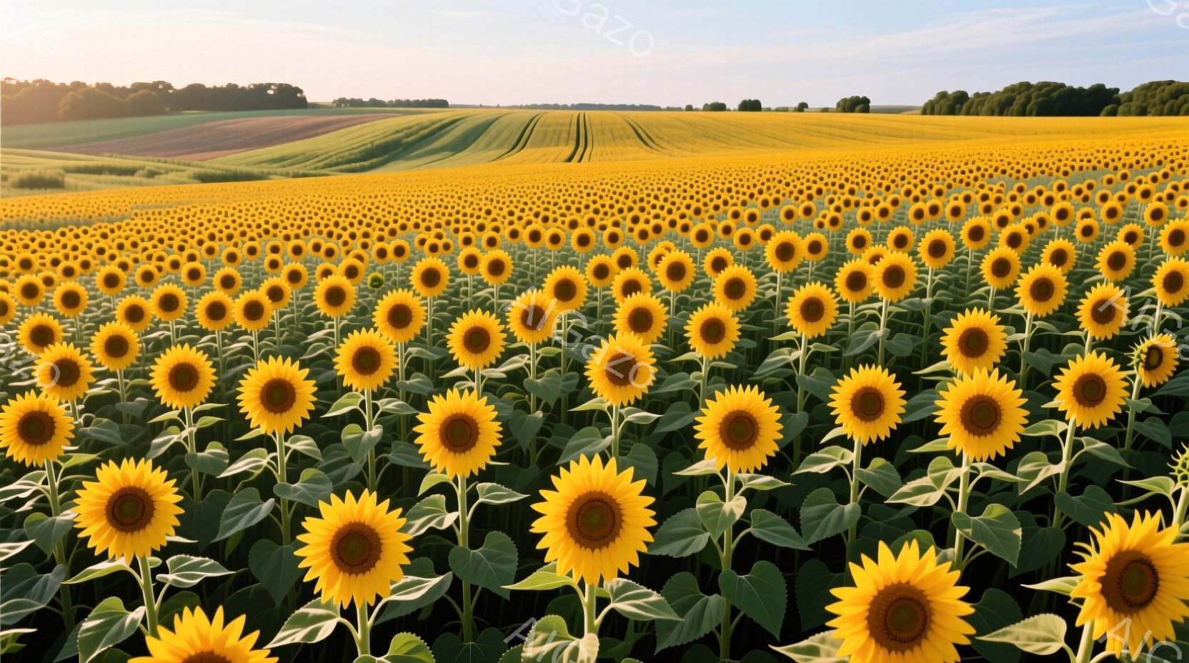 広大なひまわり畑が、視界いっぱいに広がっている。ひまわりは鮮やかな黄色で咲き誇り、緑色の茎と葉がその美しさを引き立てている。遠くには木々が見え、空は穏やかな光に包まれ、平和で温かい雰囲気を醸し出している。