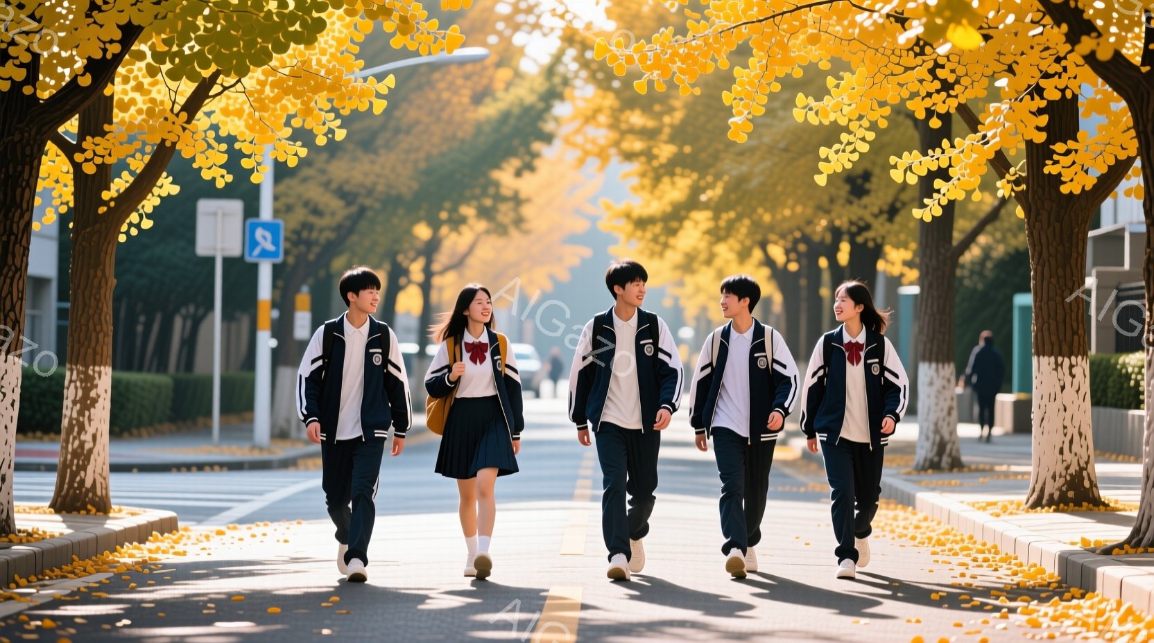 道路を歩く制服姿の高校生グループが写っている。彼らは皆、紺色のブレザーにチェック柄のスカートまたはズボンを着用し、白いシャツとネクタイを締めている。背景には、黄色の葉が茂る並木道が広がり、秋晴れの空の下、学生たちは明るい表情で歩いている。