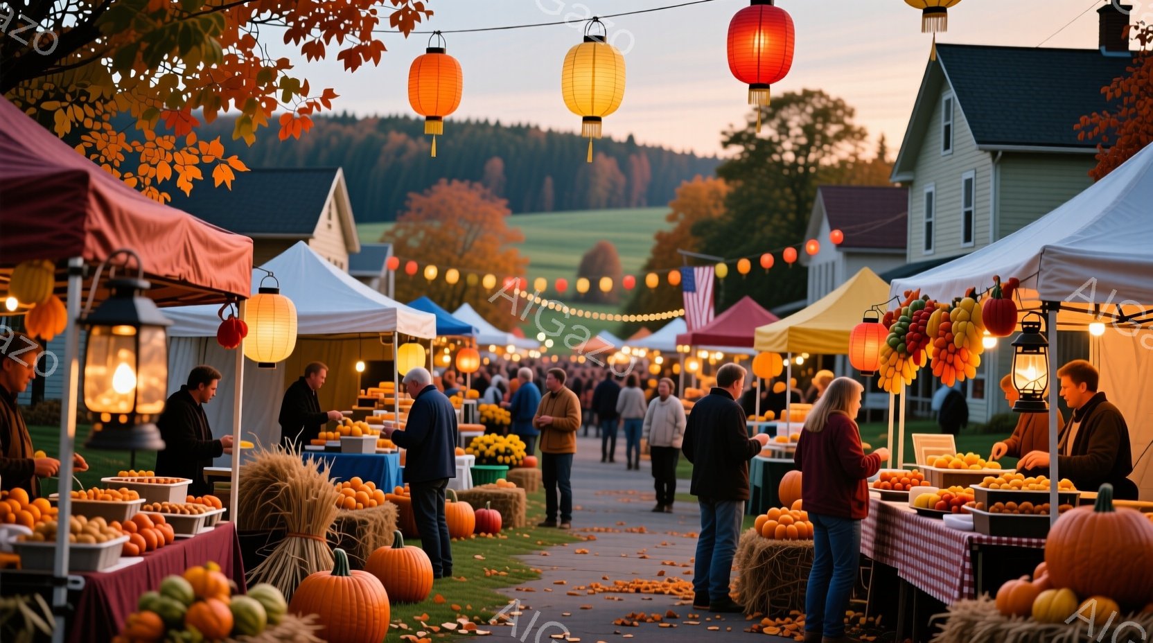 広々とした緑の芝生の上で、たくさんのカボチャや果物が並んだ屋台が並んでいます。人々はカジュアルな服装で、カボチャを選んだり、談笑したりと、秋の収穫祭を楽しんでいる様子です。背景には木々の紅葉と建物が見え、夕焼け空が暖かく、穏やかな雰囲気を醸し出しています。