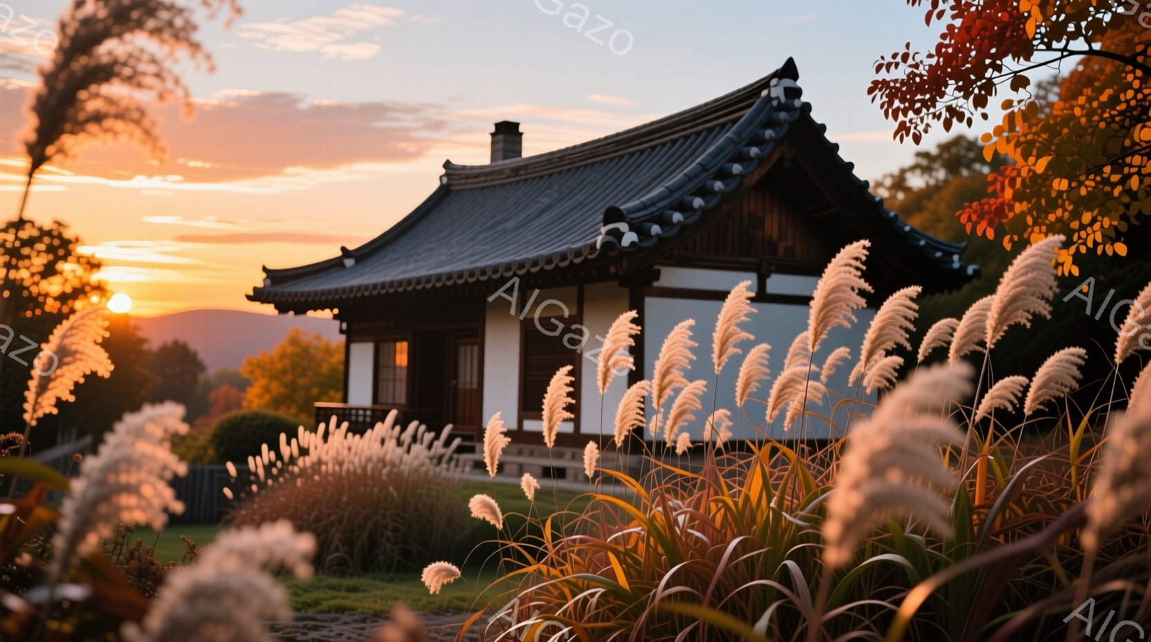 白壁と黒い屋根の日本家屋が、夕焼けに照らされたススキの草原の中に佇んでいる。家屋の周りには自然豊かな風景が広がり、穏やかで静寂な雰囲気が漂っている。空は夕焼けの色合いで美しく、全体的に温かくノスタルジックな印象を与える。