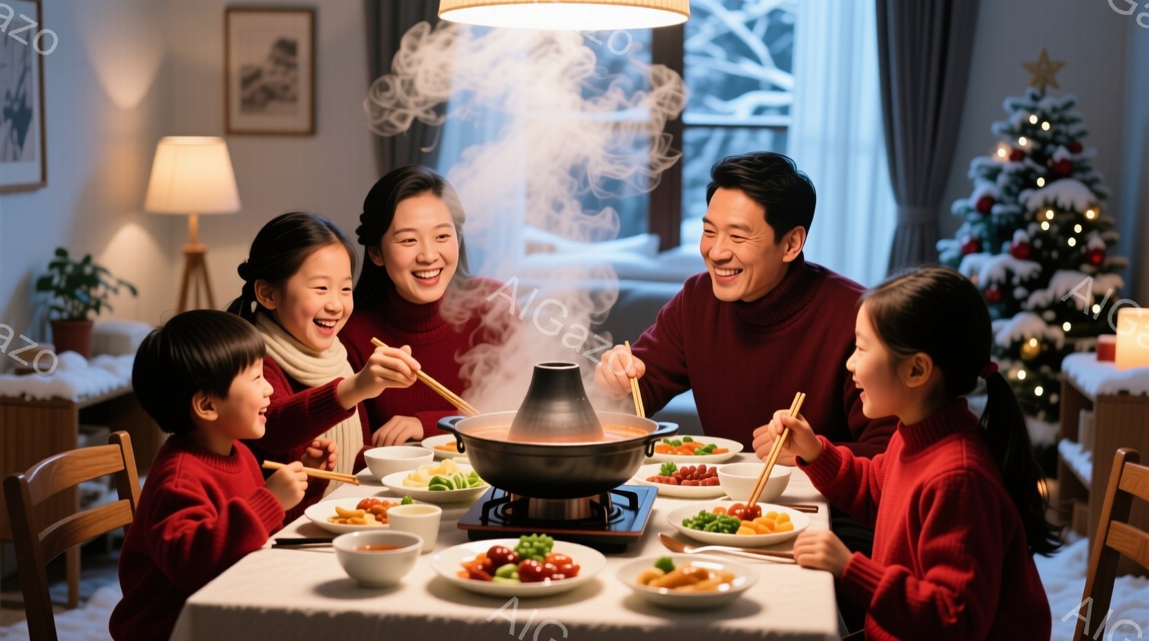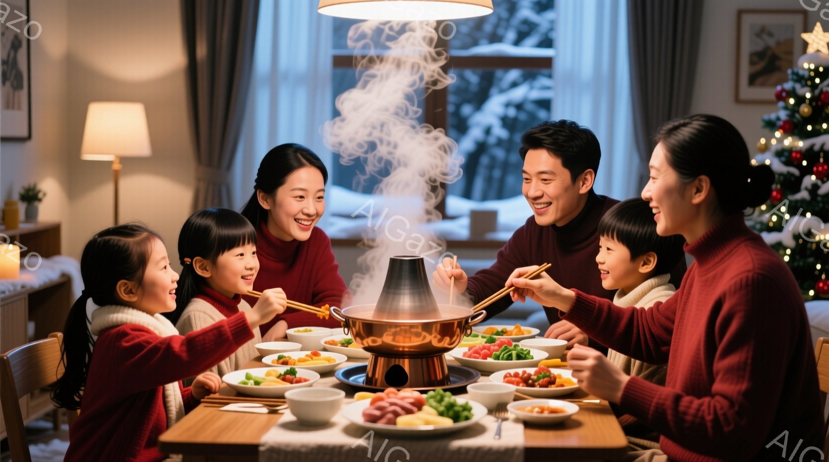 温かい雰囲気のダイニングルームで、家族が鍋料理を楽しんでいる様子が描かれています。両親は笑顔で子供たちと向き合い、皆赤いセーターを着ています。背景にはクリスマスツリーと雪景色が見え、暖かく幸せな家庭の雰囲気が伝わってきます。
