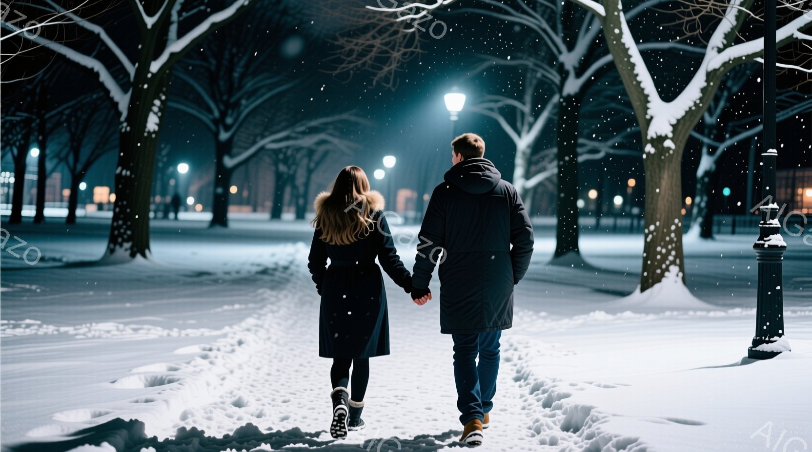 雪の降る夜、一対の男女が手をつないで雪道を歩いている。女性はファー付きのロングコートとブーツを履き、男性はダークカラーのコートとジーンズ姿で、二人は背中を見せながら並んで歩いている。背景には、雪に覆われた木々と、ぼんやりと光る街灯が並び、ロマンチックで静謐な雰囲気を醸し出している。