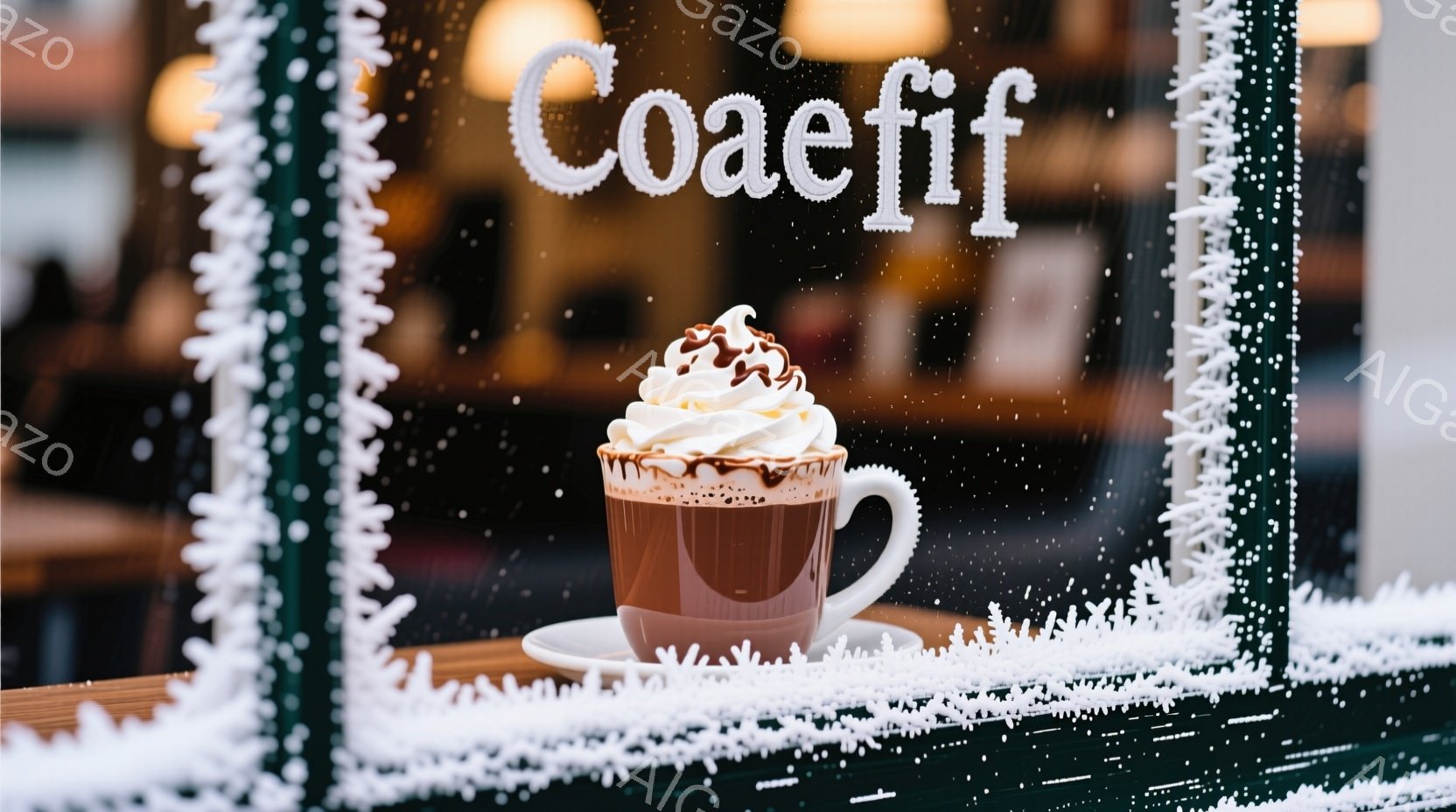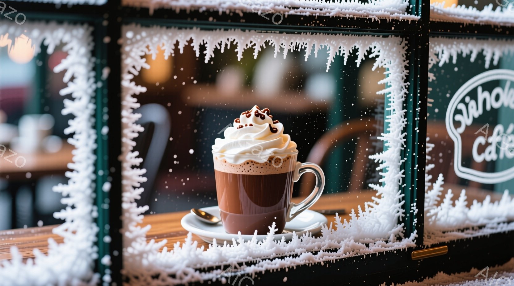 チョコレートドリンクが一杯のカップに入り、たっぷりのホイップクリームとチョコレートソースで飾られています。背景には雪の結晶が描かれたガラス窓があり、全体的に暖かく、冬の雰囲気を感じさせる静かなシーンです。カフェの看板の一部が見え、暖かい飲み物を楽しむための誘いとなっています。