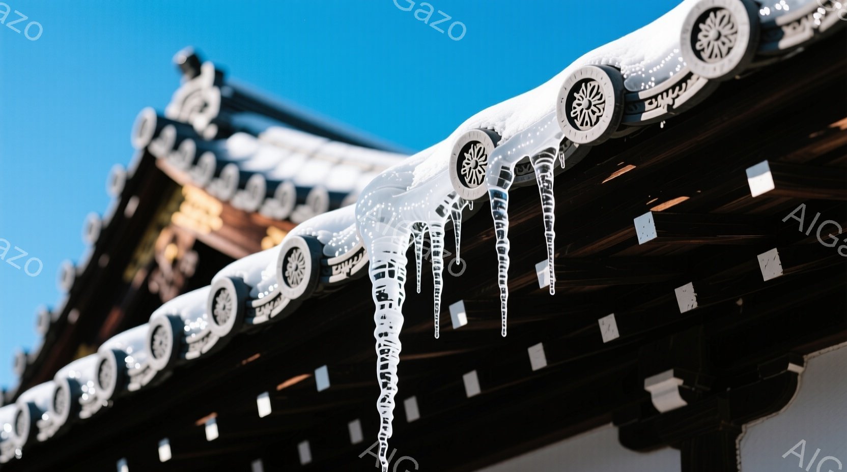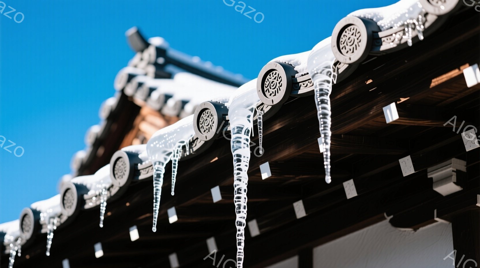 氷のつららが、伝統的な日本の建物の屋根から垂れ下がっている様子が写っている。青空を背景に、白い屋根と氷のコントラストが鮮やかで、冬の厳しさと静寂が感じられる。氷の形状は多様で、光を反射してキラキラと輝き、自然の美しさを際立たせている。