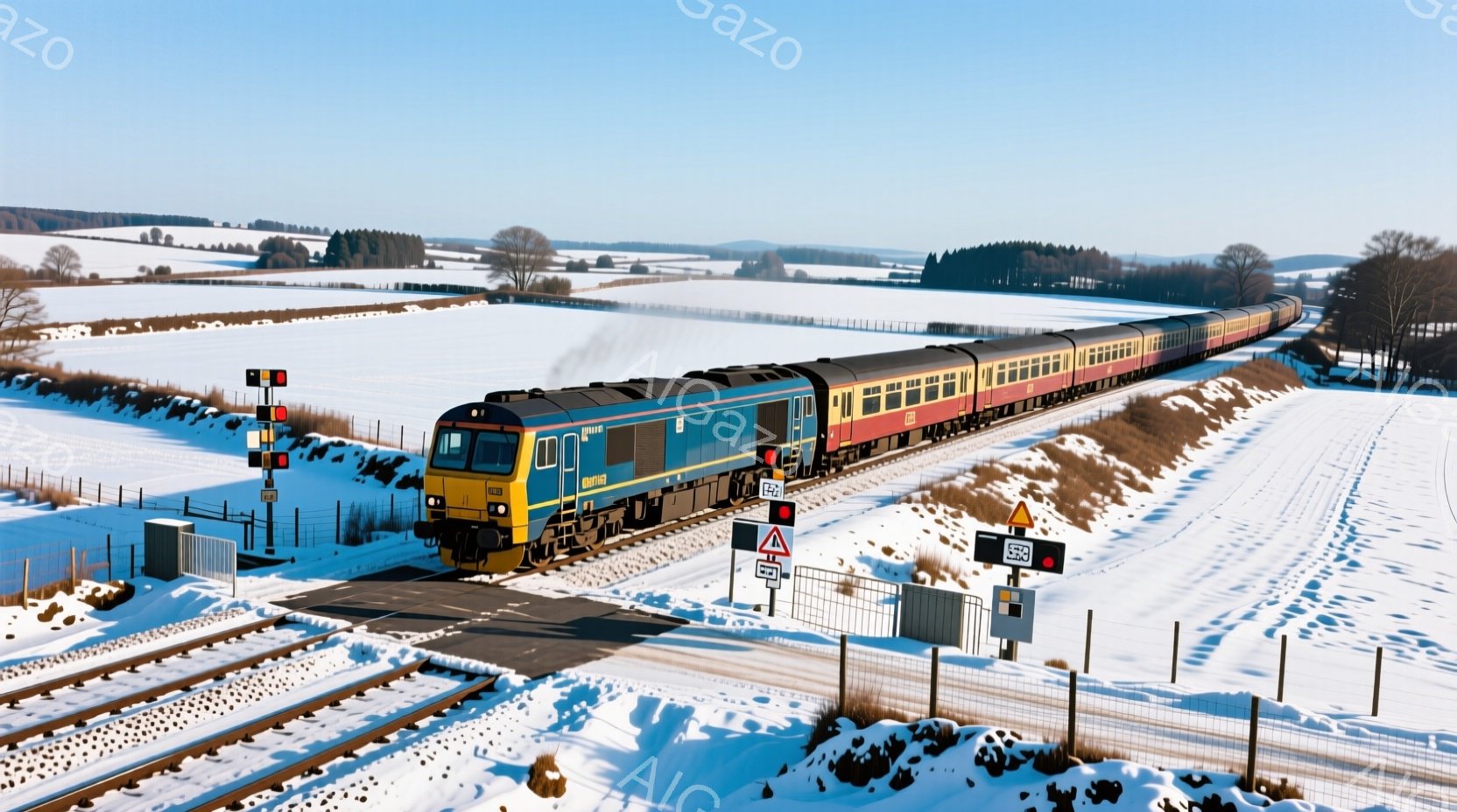 雪に覆われたイギリスの田園地帯を、青と黄色のストライプが特徴的なディーゼル機関車が牽引する列車が疾走している。背景には白い雪景色が広がり、遠くには建家が見えるが、全体的に静かで冬の厳しさを感じさせる。機関車からは白い蒸気が立ち上り、寒さの中を走る列車の様子が印象的である。
