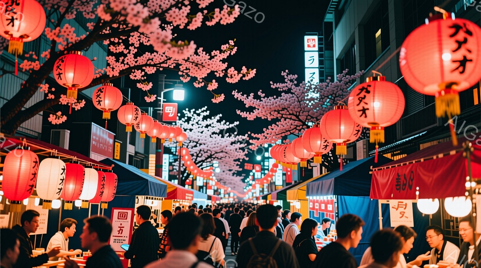 賑やかな夜の商店街で、多くの人々が歩いている様子が描かれている。提灯が空中に飾られ、桜の装飾が春の訪れを感じさせ、活気にあふれた雰囲気が伝わってくる。人々はカジュアルな服装で、楽しそうに歩き、あるいは立ち止まって周囲を眺めている。