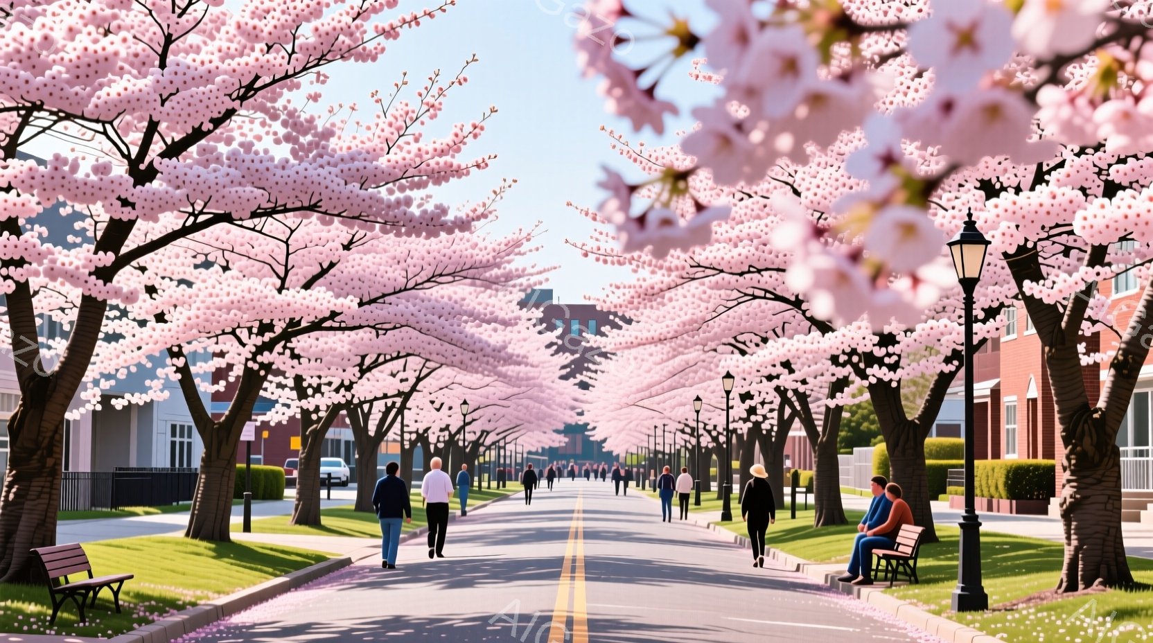道路の両脇に桜並木が咲き誇り、ピンク色のトンネルが形成されている。白い車が数台、道路を走っており、背景には住宅と遠くの山々が見える、晴れた日の穏やかな春の風景だ。全体的に、暖かく、希望に満ちた、春の訪れを感じさせる雰囲気である。