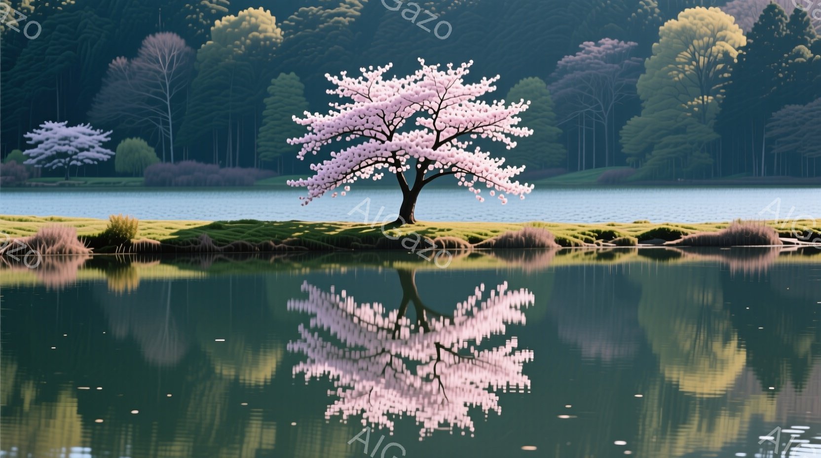 静かな湖に、満開の桜が映る風景です。湖面は穏やかで、桜の鮮やかなピンク色が水面に映り込み、美しい対照を作り出しています。背景には緑豊かな山々が連なり、春の穏やかな一日を表現しています。