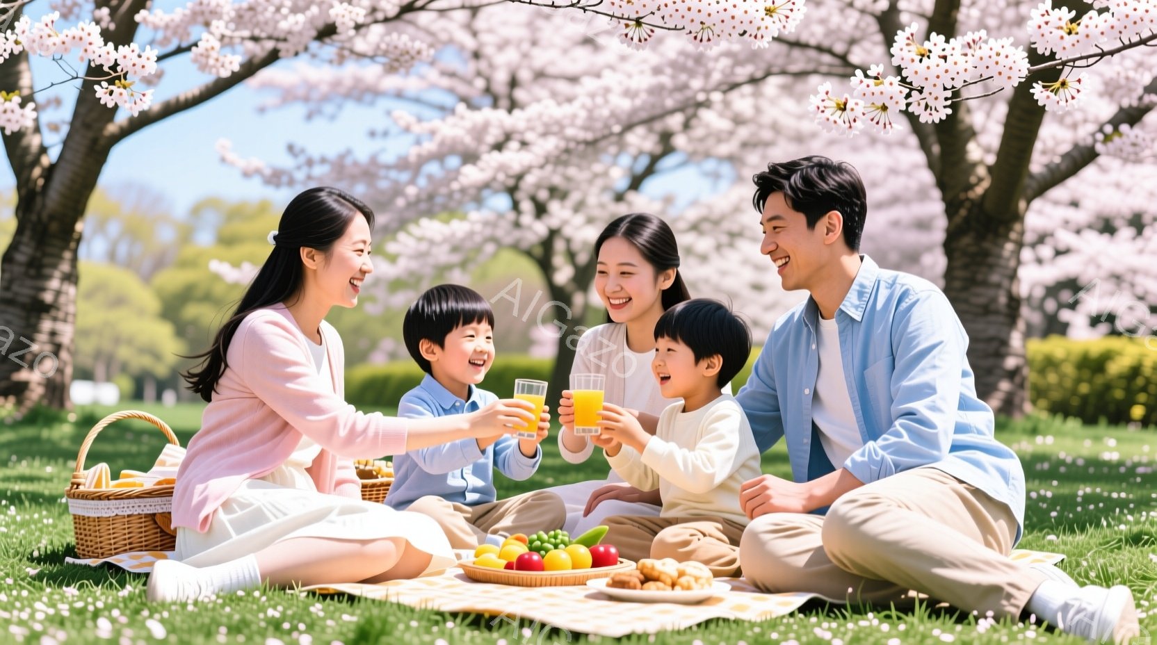 桜の花びらが舞う青いレジャーシートの上で、若い男女4人がピクニックを楽しんでいる。それぞれ白いTシャツやデニムジャケットを着ており、明るい表情で飲み物や弁当を手にしている。背景には桜並木が広がり、春の暖かな日差しの中でリラックスした雰囲気が漂っている。