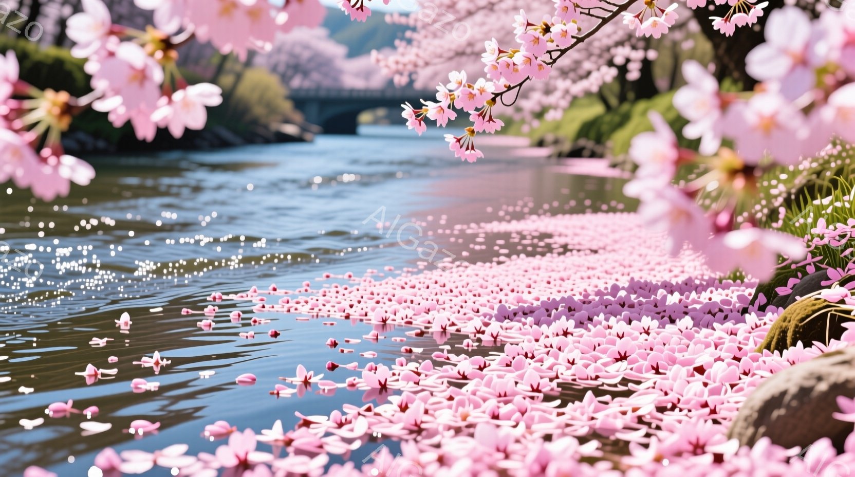 桜の花びらが水面に広がり、まるでピンク色の絨毯のようだ。背景にはぼんやりと緑豊かな山並みと、遠くに見える橋が確認でき、春の穏やかな陽気が感じられる。全体的に柔らかく、幻想的な雰囲気が漂っている。