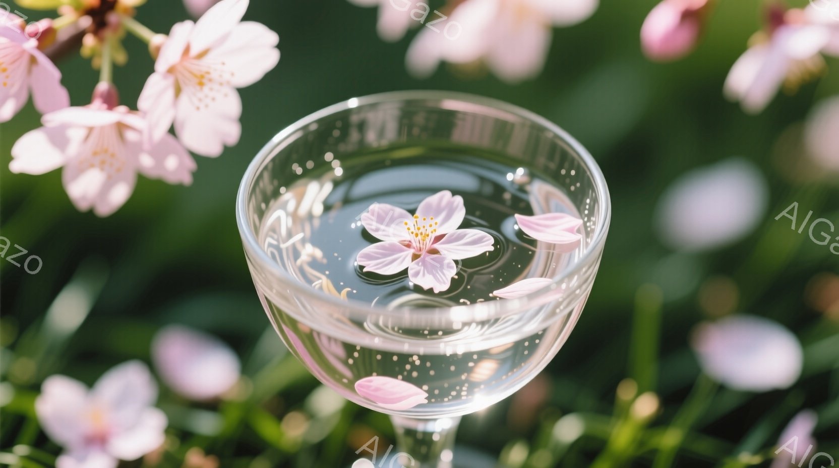 ピンク色の桜の花びらが水が入ったグラスの中に浮かんでおり、その周りにはさらに桜の花が咲き乱れている様子が捉えられています。背景は緑豊かな自然で、春の穏やかな日差しが感じられます。全体的に、優雅で静謐な雰囲気が漂い、春の美しさを表現しています。