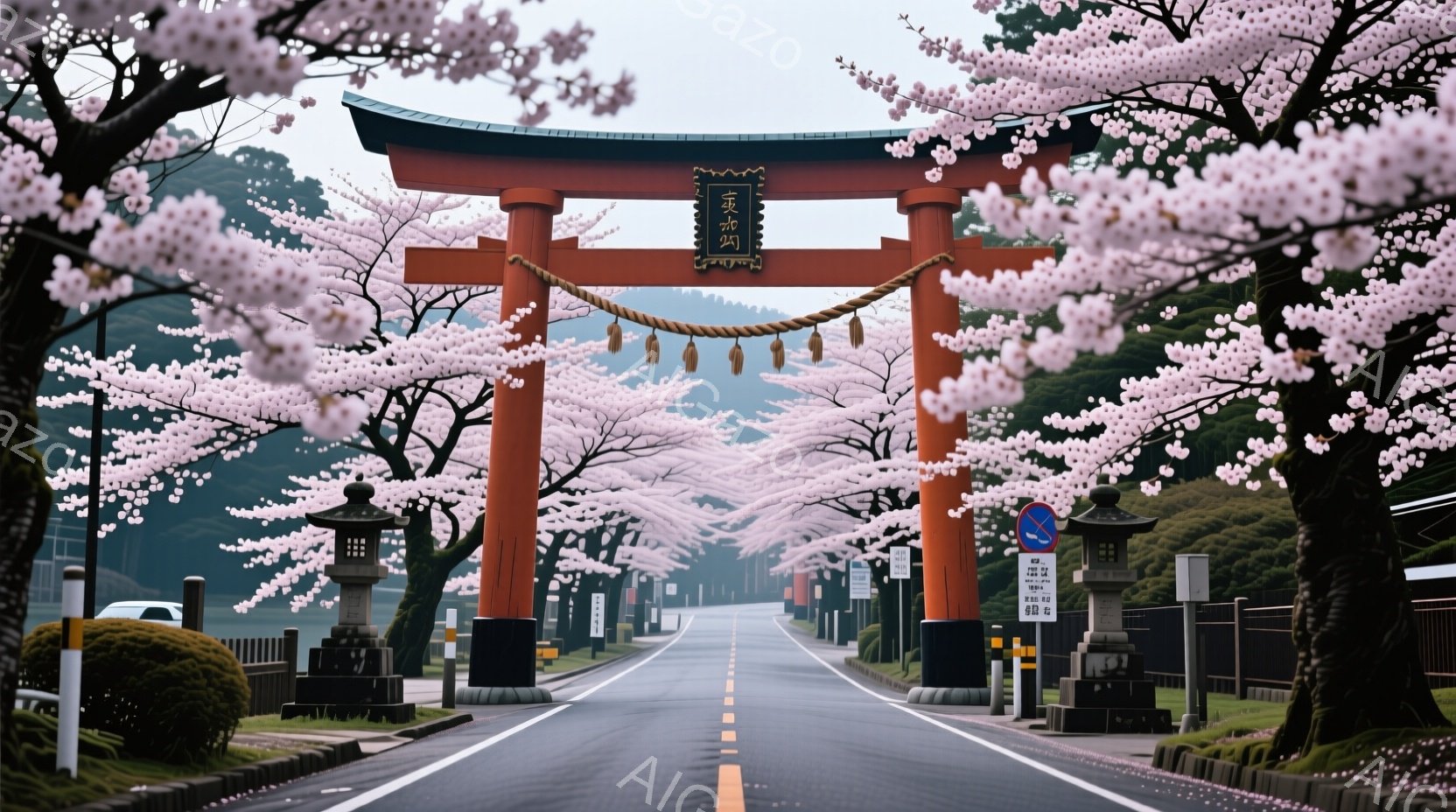 鮮やかな朱色の鳥居が、桜並木の中を走る道路に立っている。道路の両側には提灯が並び、遠くには穏やかな水面が見える桜の木からは花びらが舞い散り、春の訪れを感じさせる。全体的に静かで幻想的な雰囲気が漂っている。