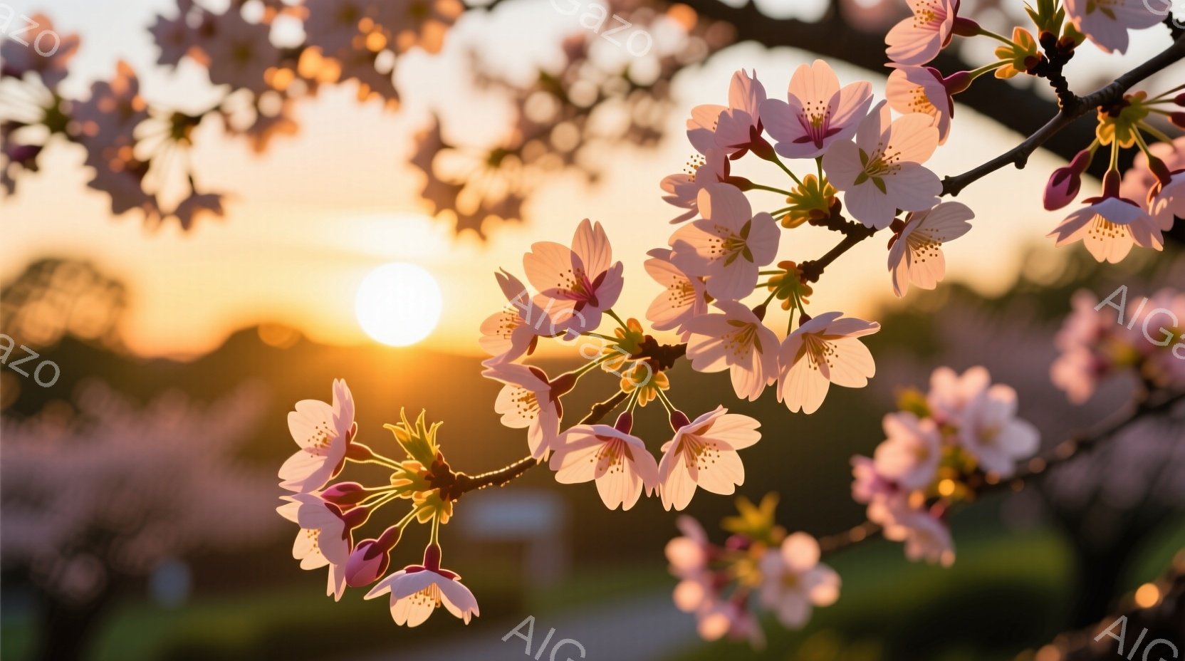 桜の花が咲き誇る枝が、夕焼けの柔らかな光に照らされている。薄桃色の花びらは繊細で、背景のぼやけた風景と調和し、穏やかな春の訪れを感じさせる。空はオレンジ色とピンク色に染まり、暖かく優しい雰囲気を作り出している。
