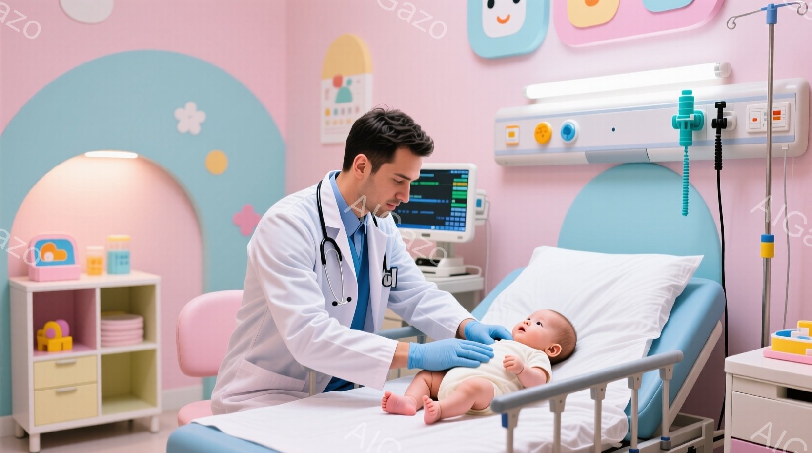 白衣を着た男性医師が、病院のベッドに横たわる赤ちゃんに優しく触れています。医師は青い手袋を着用し、真剣な表情で赤ちゃんの状態を確認しているようです。背景には、パステルカラーの壁と医療機器、そしておもちゃが置かれた棚が見え、全体的に穏やかで安心感のある雰囲気が漂っています。