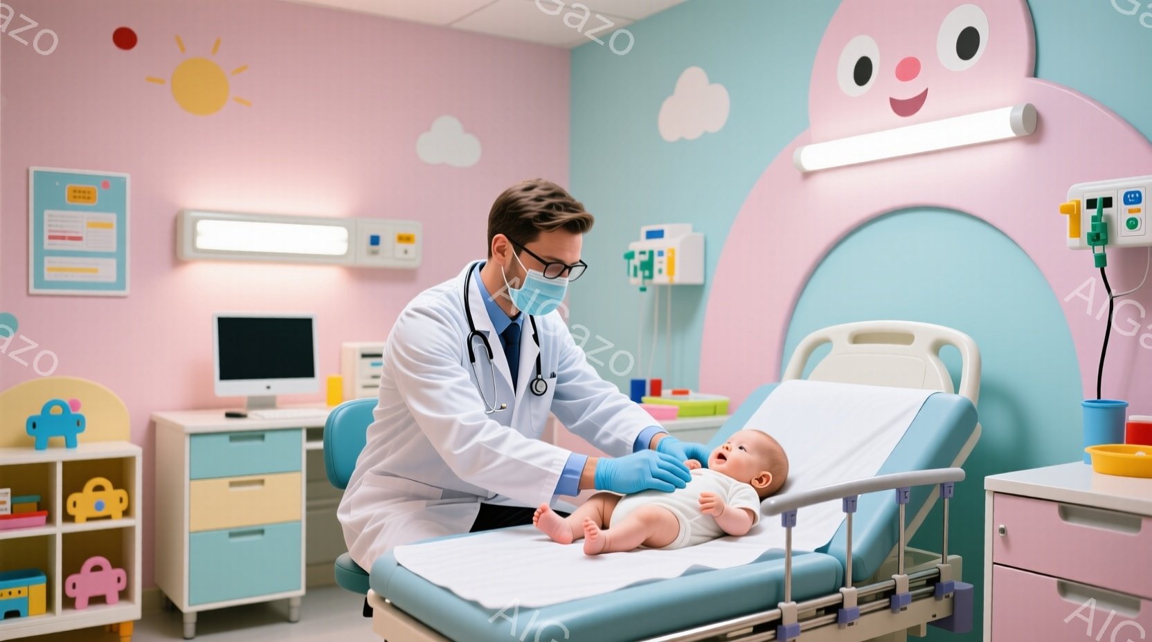 白衣を着た男性医師が、病院のベッドに横たわる赤ちゃんを診察している。医師はブルーの手袋を着用し、真剣な表情で赤ちゃんの足に触れている。背景には、カラフルな壁画と医療機器があり、全体的に温かく安心感のある雰囲気が漂っている。
