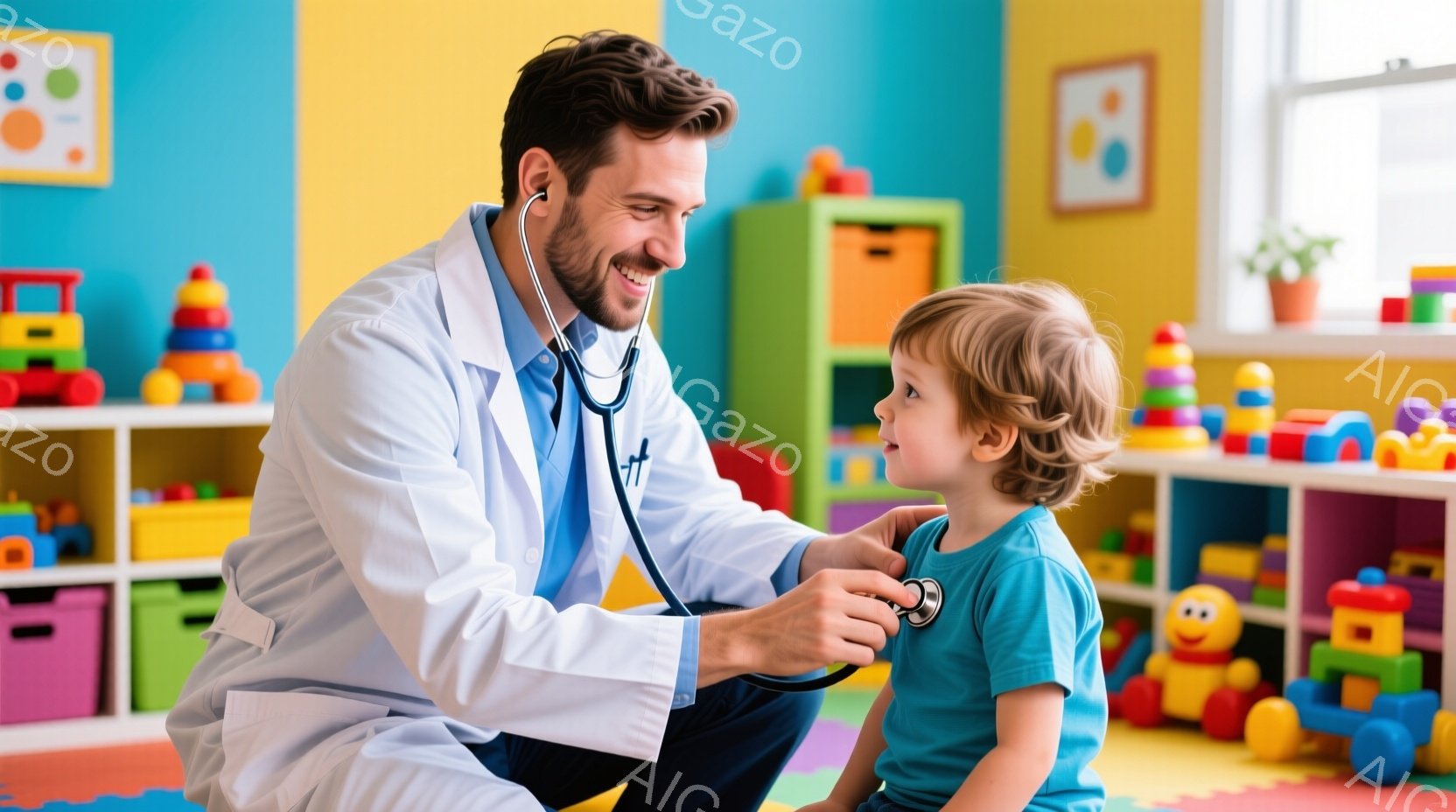 白衣を着た若い男性医師が、幼い男の子の胸に聴診器を当てています。医師は微笑んでおり、男の子も楽しそうに笑っています。背景には、カラフルな積み木や棚があり、明るく遊び心のある診察室の雰囲気です。